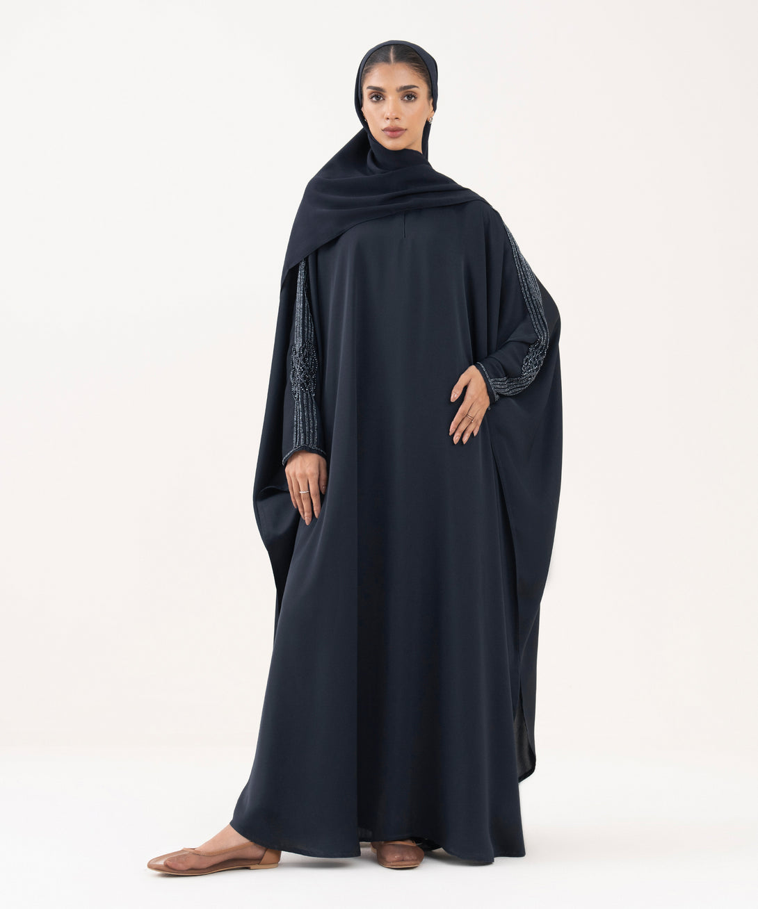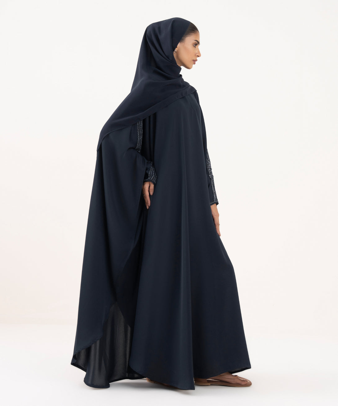 Full length kaftan abaya set in soft and drapey fabric. Featuring crew neckline with long slit and fabric button closure.hand embellished detail on shoulder seam and hijab.