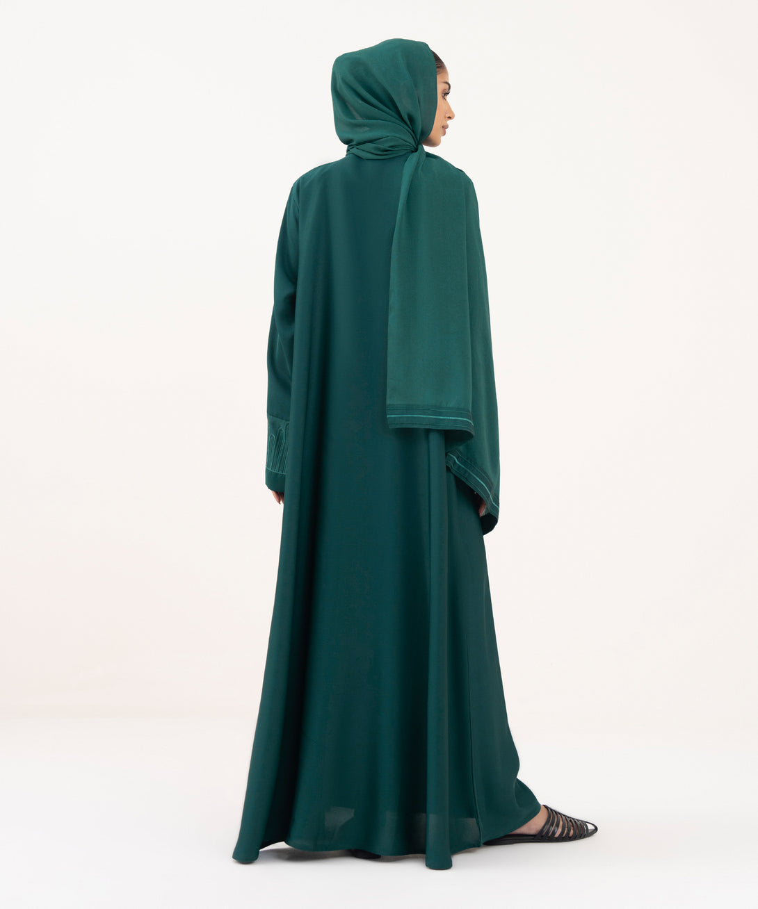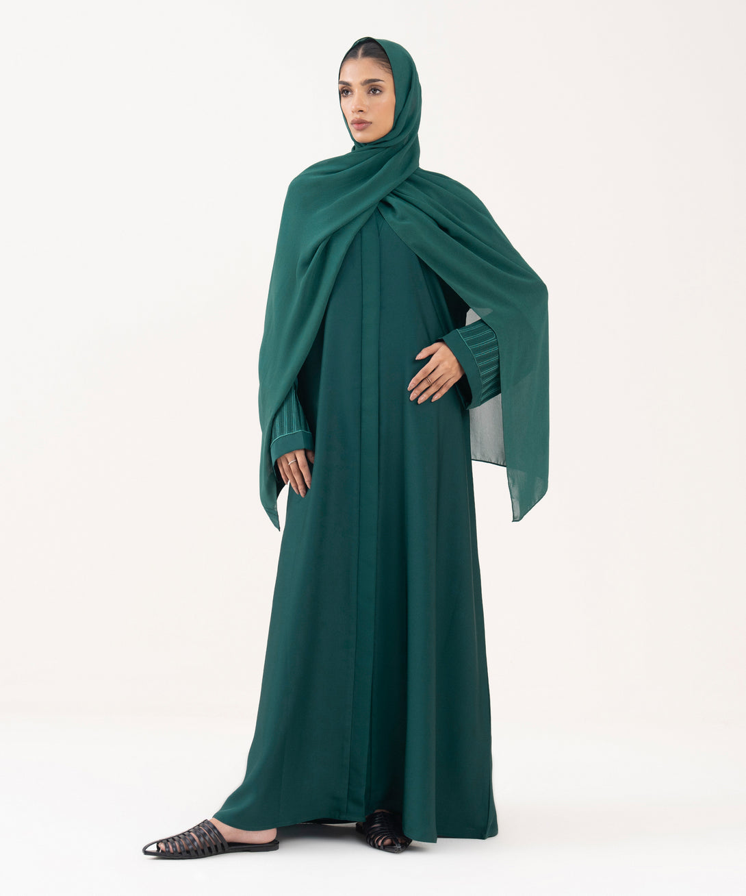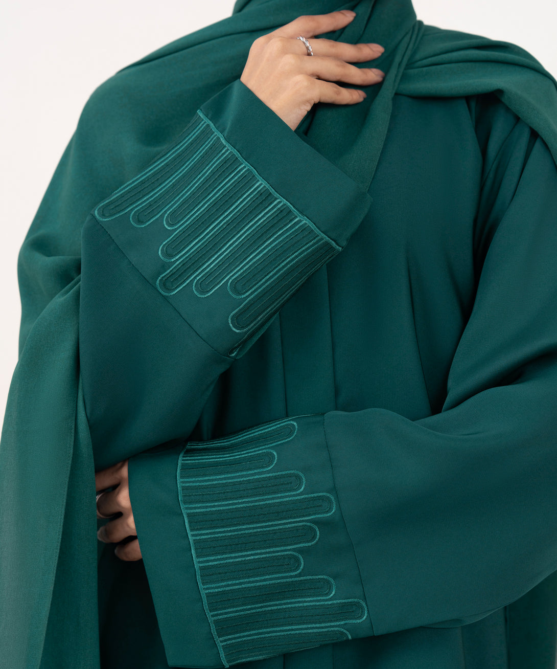 Full length abaya in soft drapey nida fabric. Button through front opening with v neckline. Full sleeves with embroidery. Embroidered hijab included.