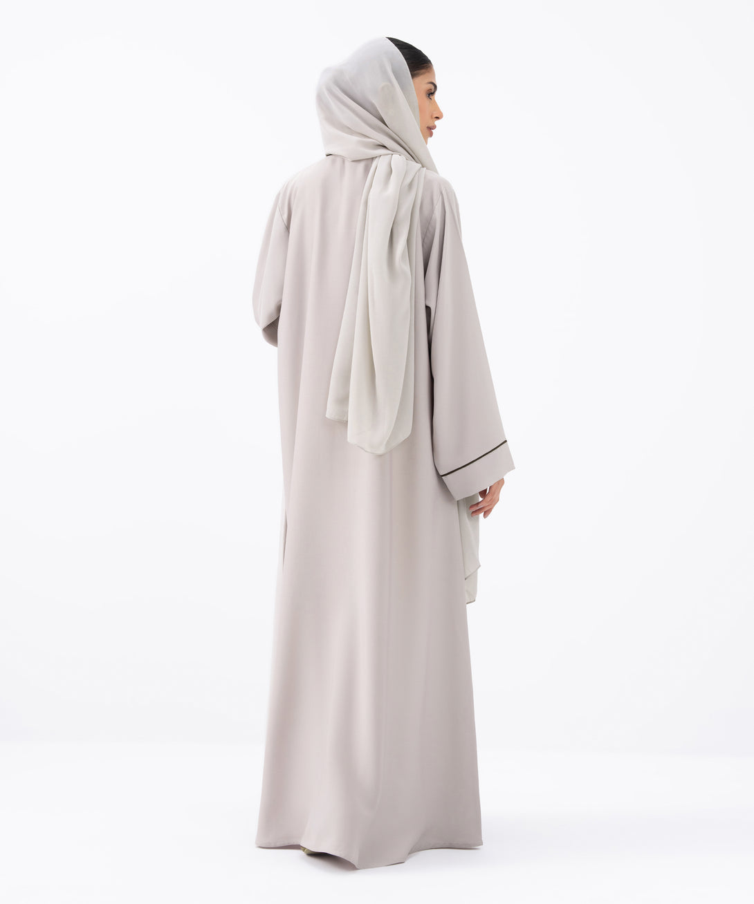 Full length abaya in soft drapey fabric with button through front. V-neckline. Contrast piping on placket and sleeve cuffs.