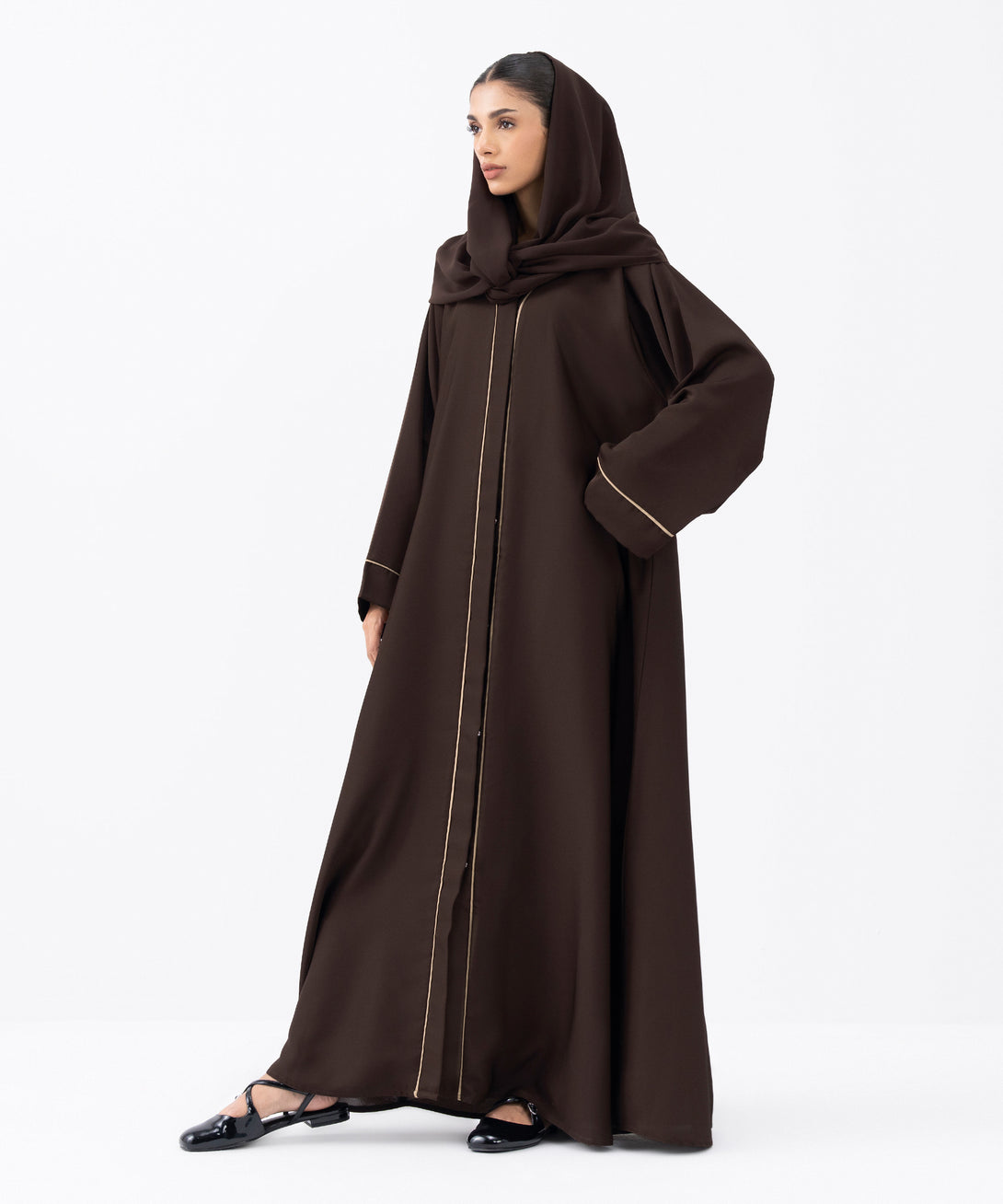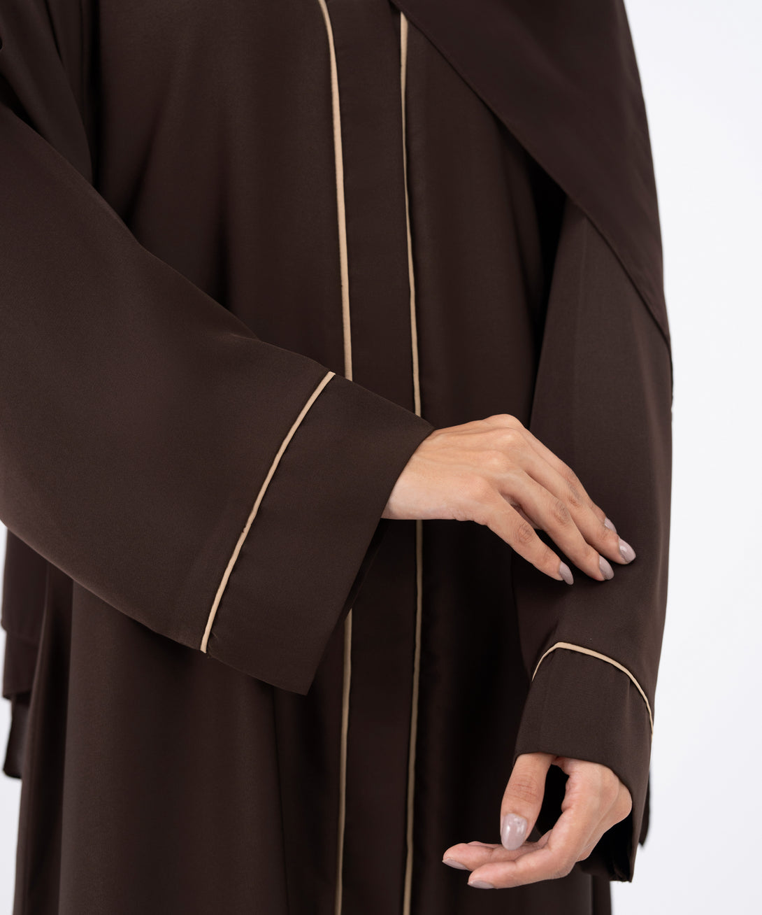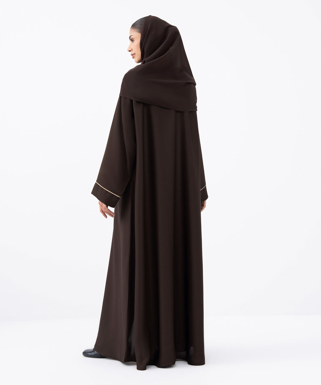 Full length abaya in soft drapey fabric with button through front. V-neckline. Contrast piping on placket and sleeve cuffs.