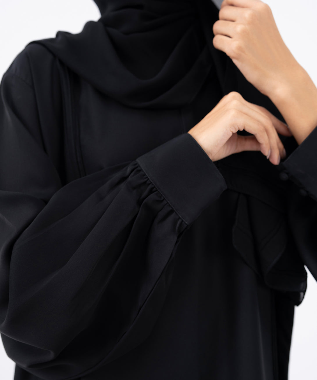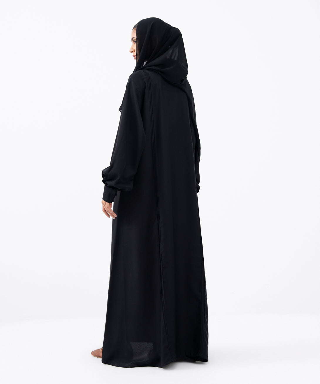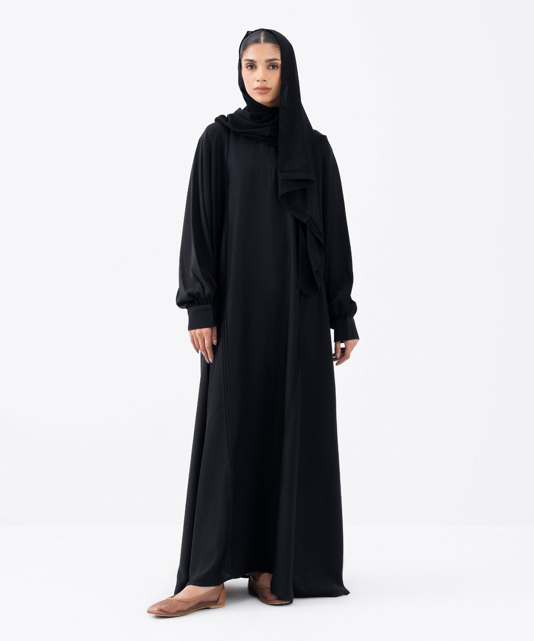 Full length abaya set in soft drapey fabric. Pin tuck detail on front. Crew neckline. Loop button closure. Full length sleeve with cuffs. Hijab included.