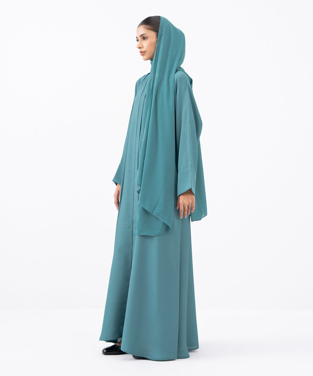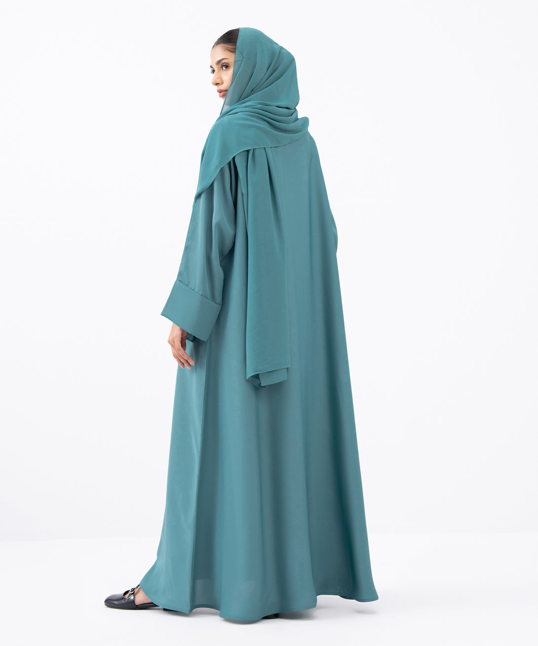 Full length abaya set in soft drapey fabric. Button through front opening. V-neckline. Kimono sleeves with turned-up cuffs. Hijab included.