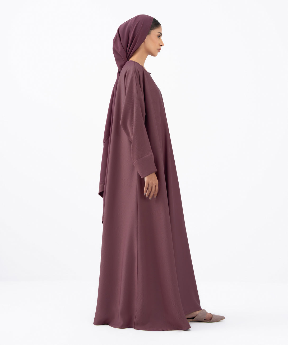 Full length double layered abaya set. Inner layer in soft drapey fabric and textured upper layer. Crew neckline with button closure. Kimono sleeve. Matching hijab with textured fabric border.