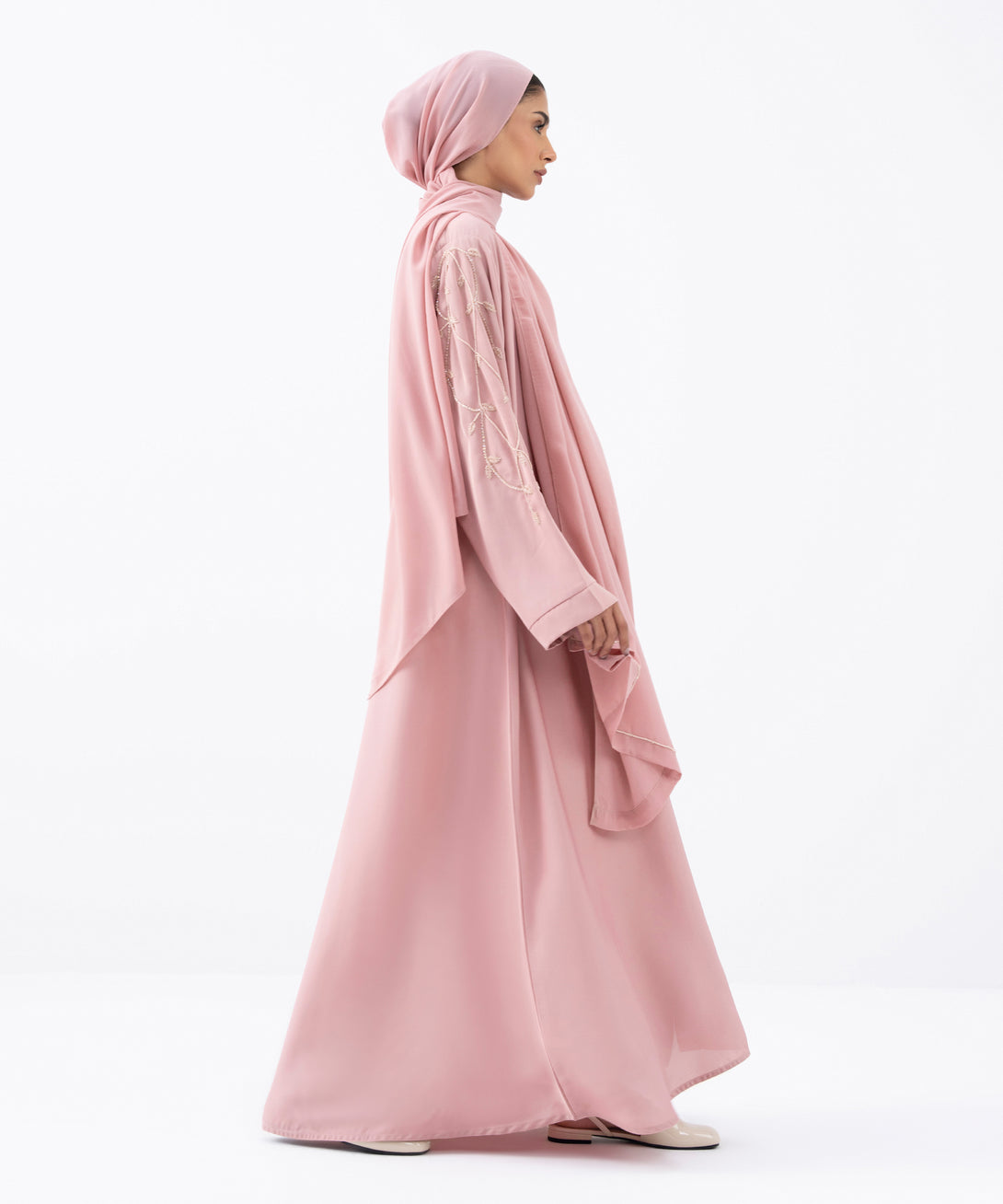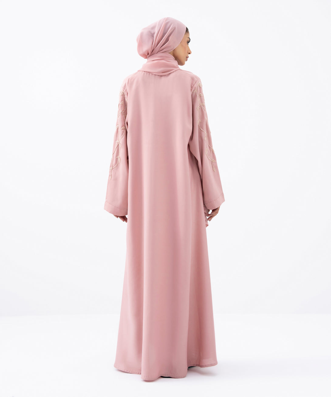 Full length abaya set in a soft drapey fabric with button through front opening. V neckline. Hand embellishment detail on sleeves and hijab.