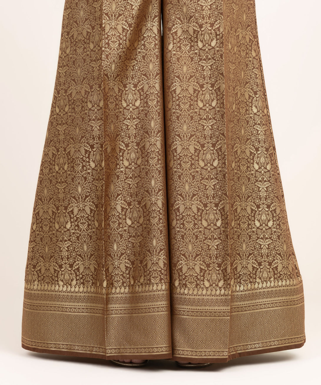 Step out in style in our dyed brown extra weft jacquard sharara.