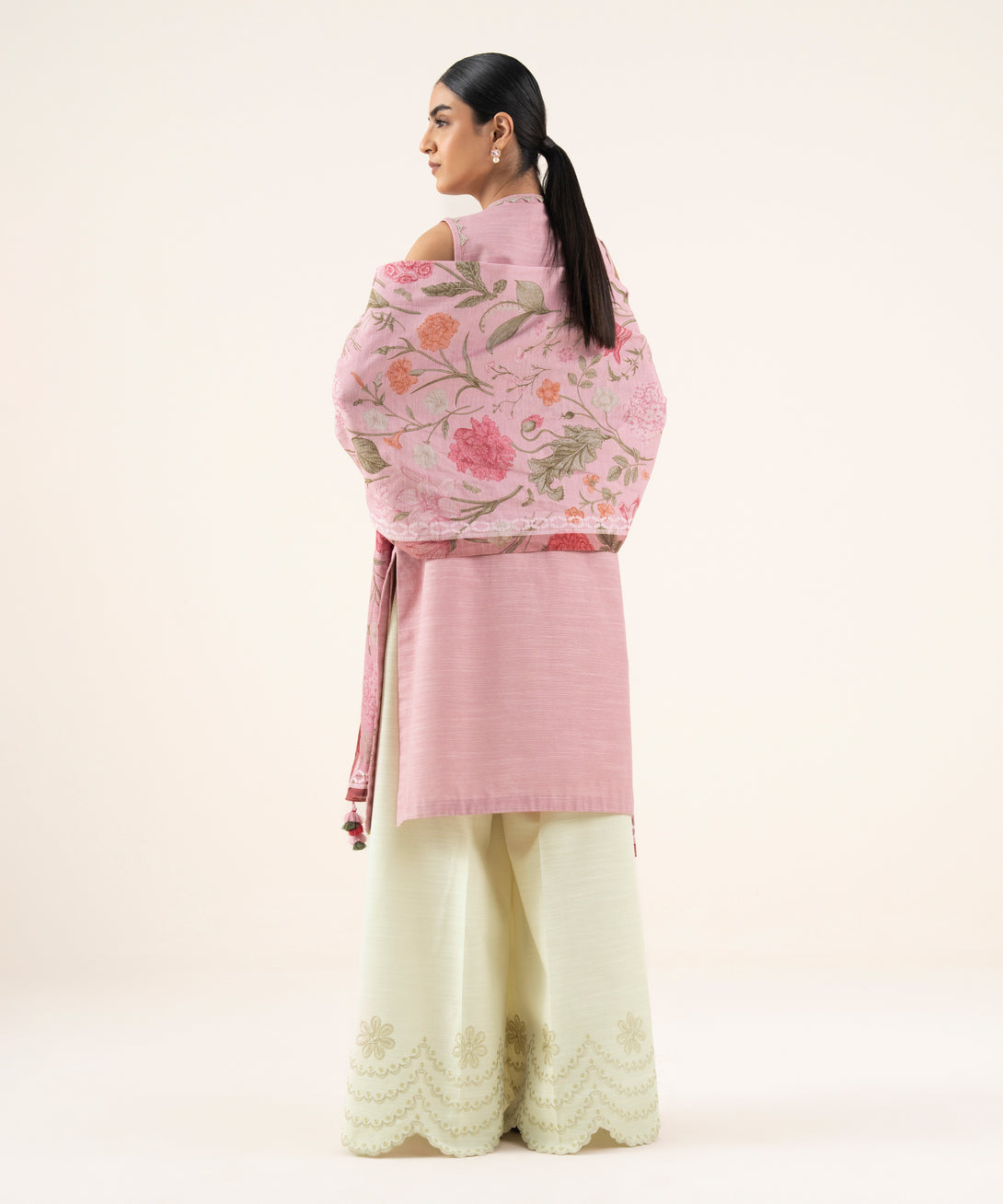 Make a statement with our two-piece embroidered powder pink ensemble featuring a cotton shirt paired with a voile dupatta.