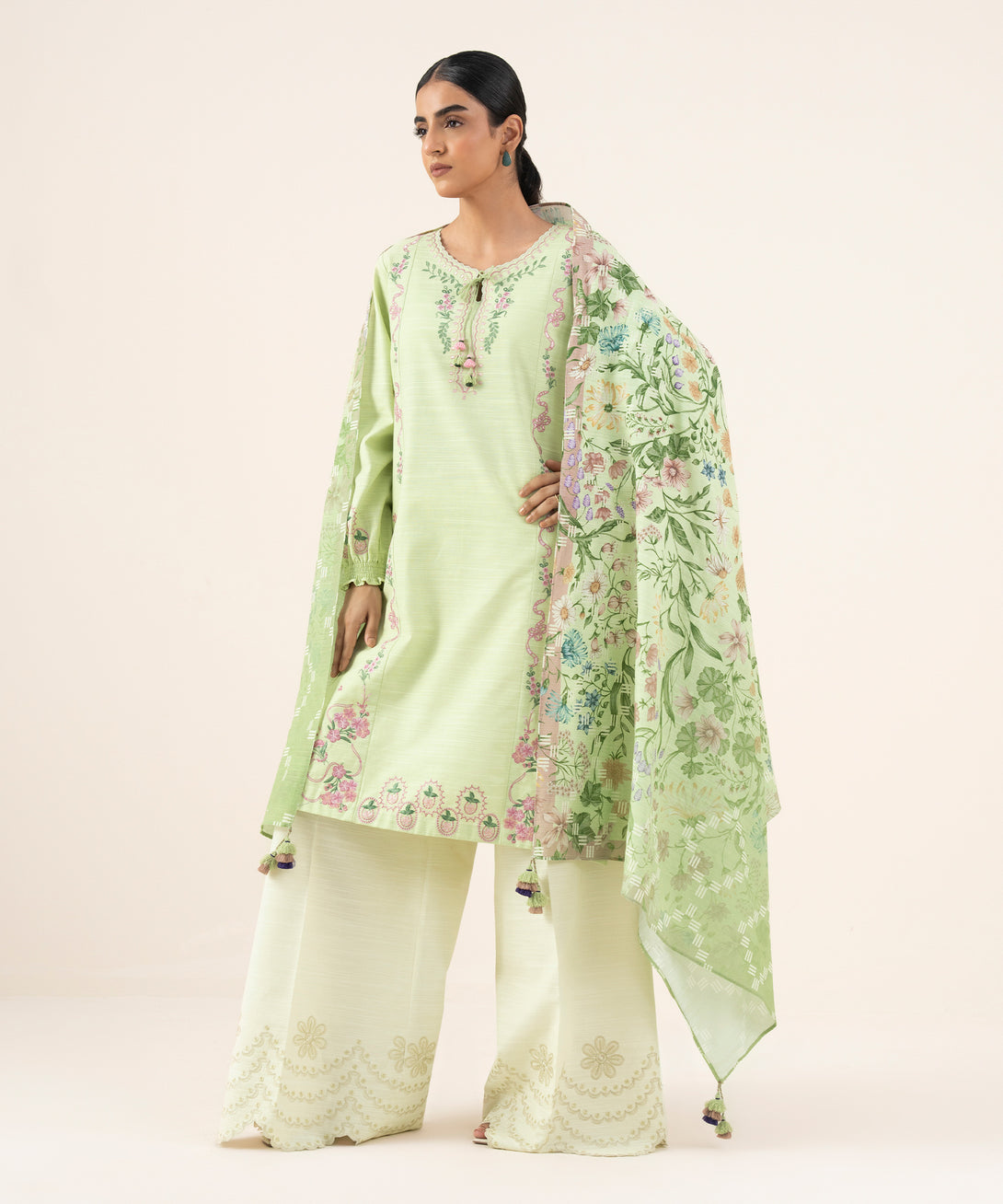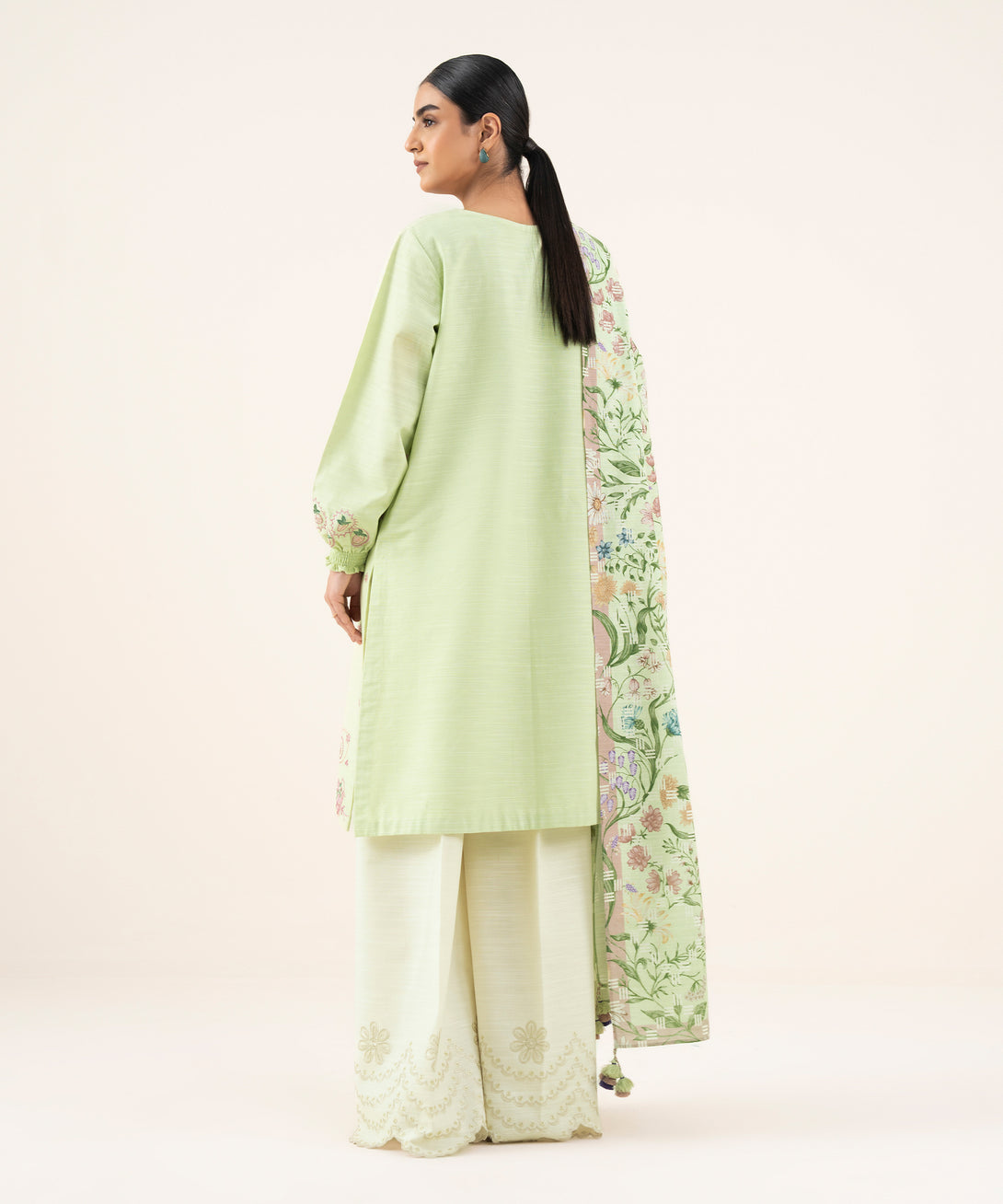 Make a statement with our two-piece embroidered apple green ensemble featuring a cotton shirt paired with a textured voile dupatta.