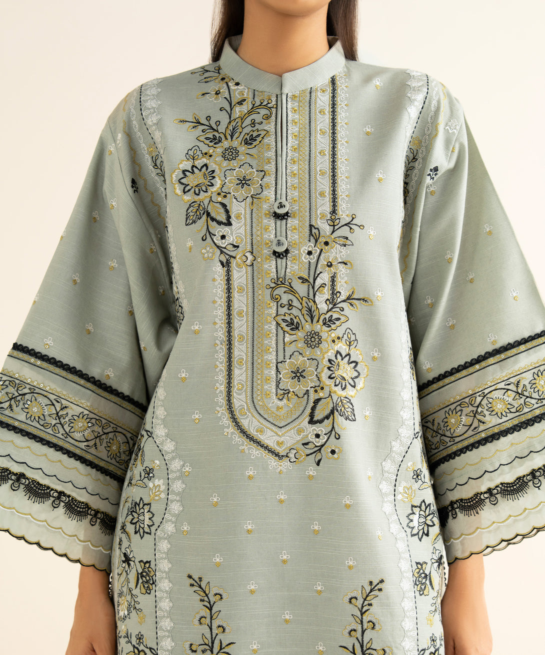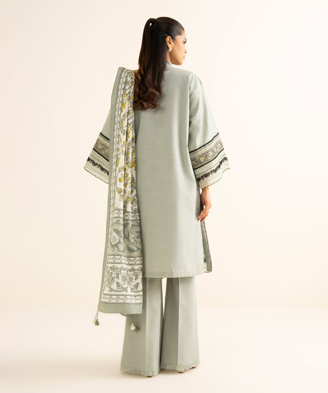 Make a statement with our three-piece embroidered light grey ensemble featuring a cotton shirt and trousers paired with a matching blended chiffon dupatta.