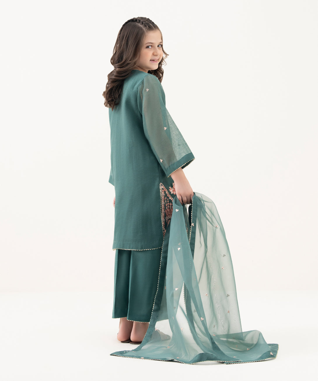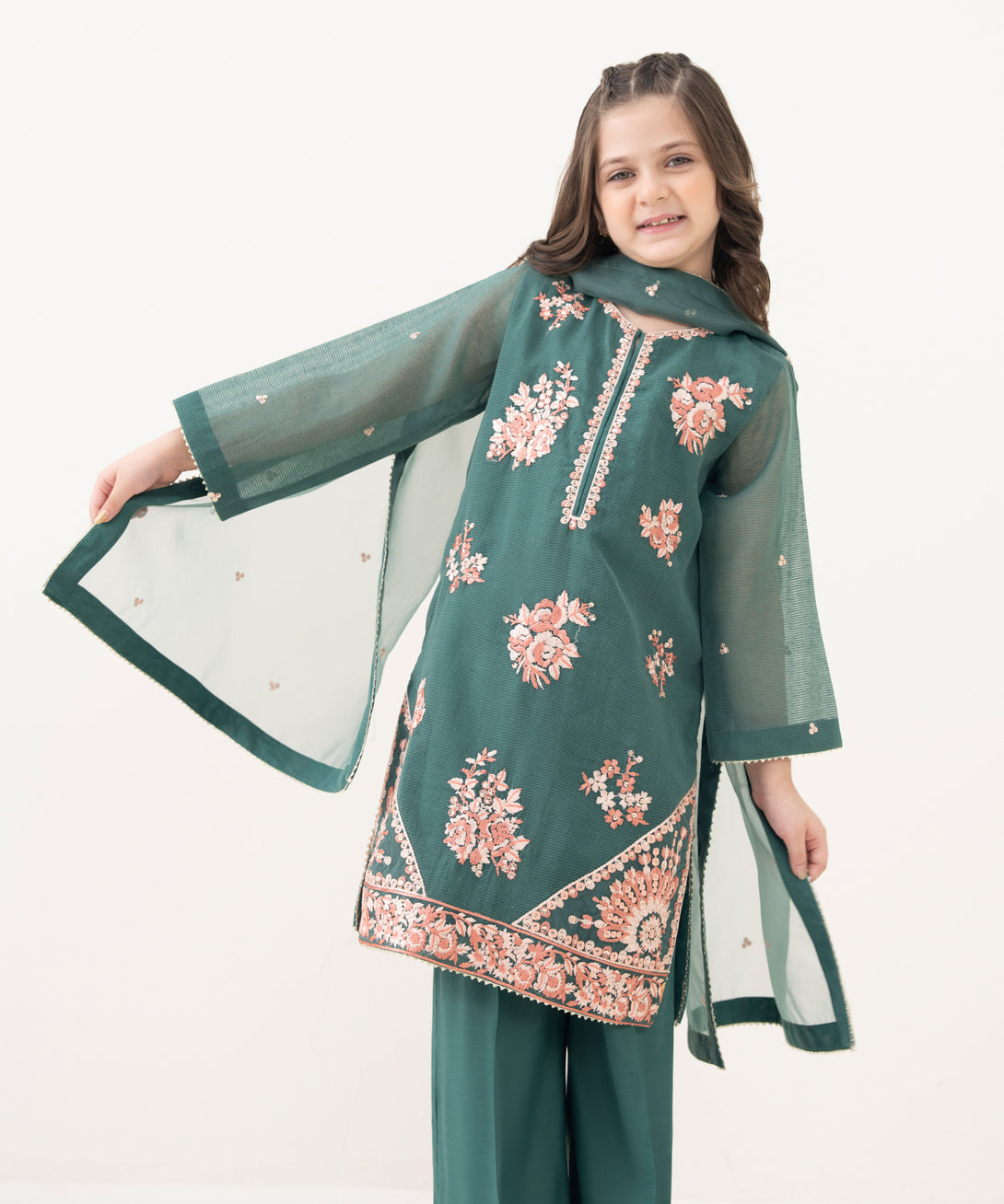 Dress your little one in our embroidered green blended textured karandi A-line shirt paired with matching viscose raw silk flared trousers and a blended organza dupatta.