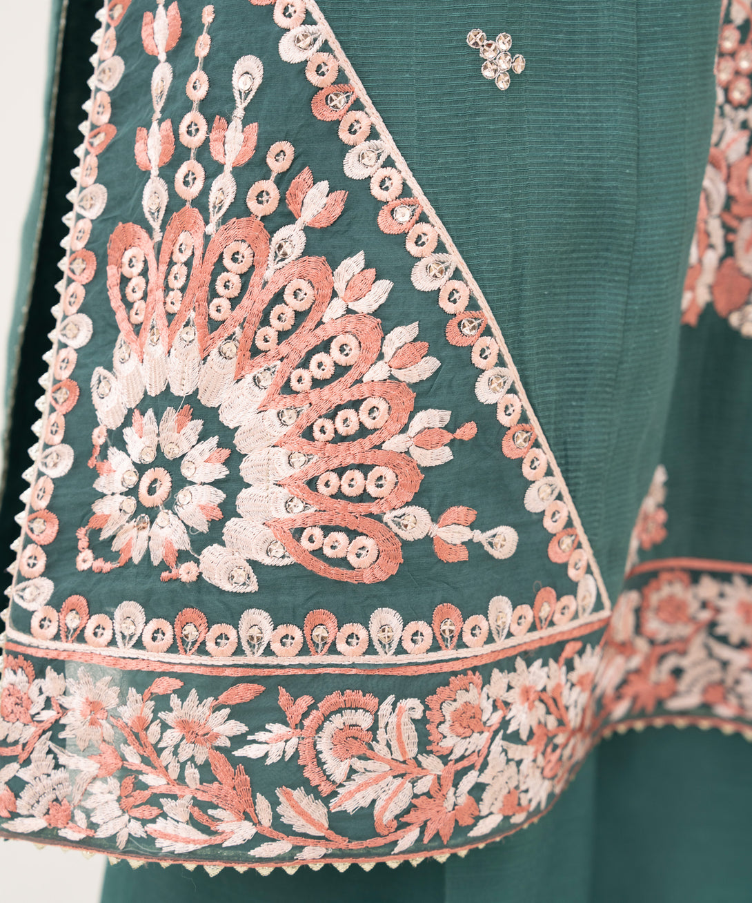 Make a statement in our embroidered green blended textured karandi A-line shirt featuring a round neckline with slit.