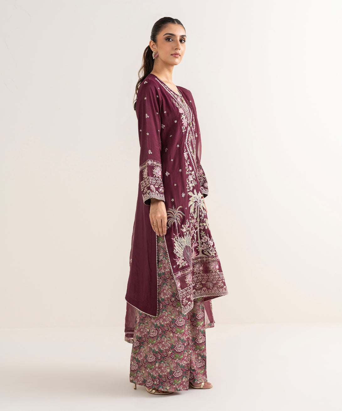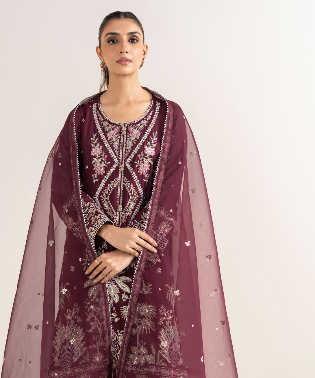 Make a style statement in our embroidered purple A-line viscose raw silk shirt paired with matching flared trousers and a blended organza dupatta.