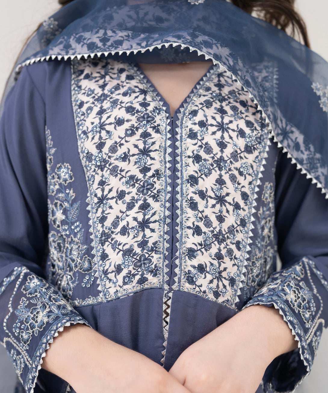 Dress your little one in our embroidered blue viscose raw silk flared A-line shirt paired with matching culottes and a blended organza dupatta.