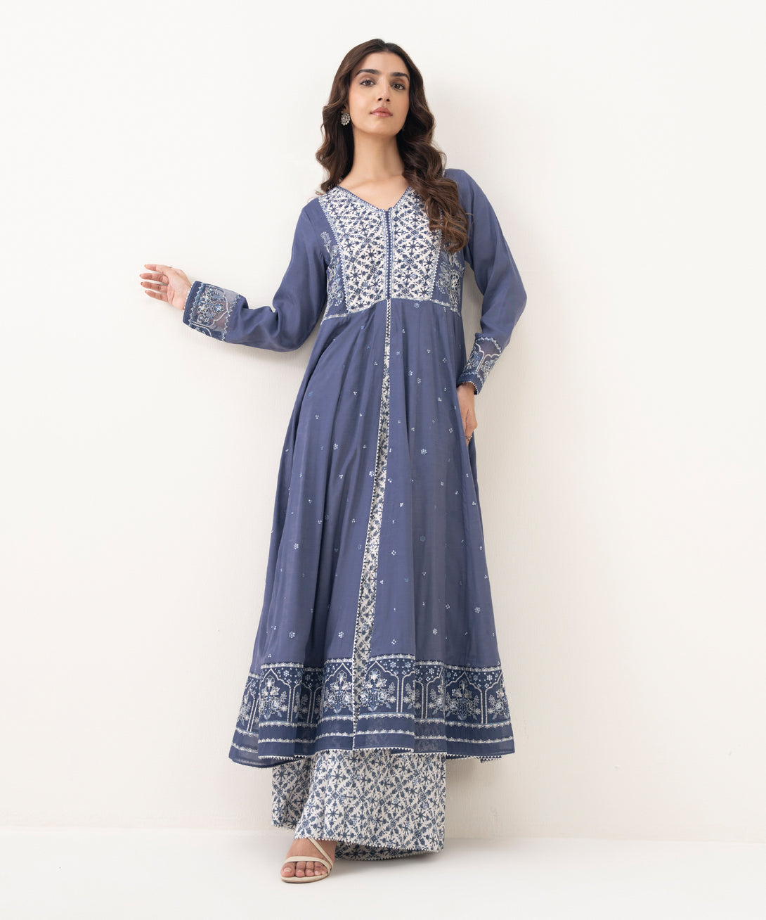 Dyed With Embroidered Sequins And Lace Finish Front Panel, Dyed Back Panel, V Neckline, Full Sleeves, Long Length