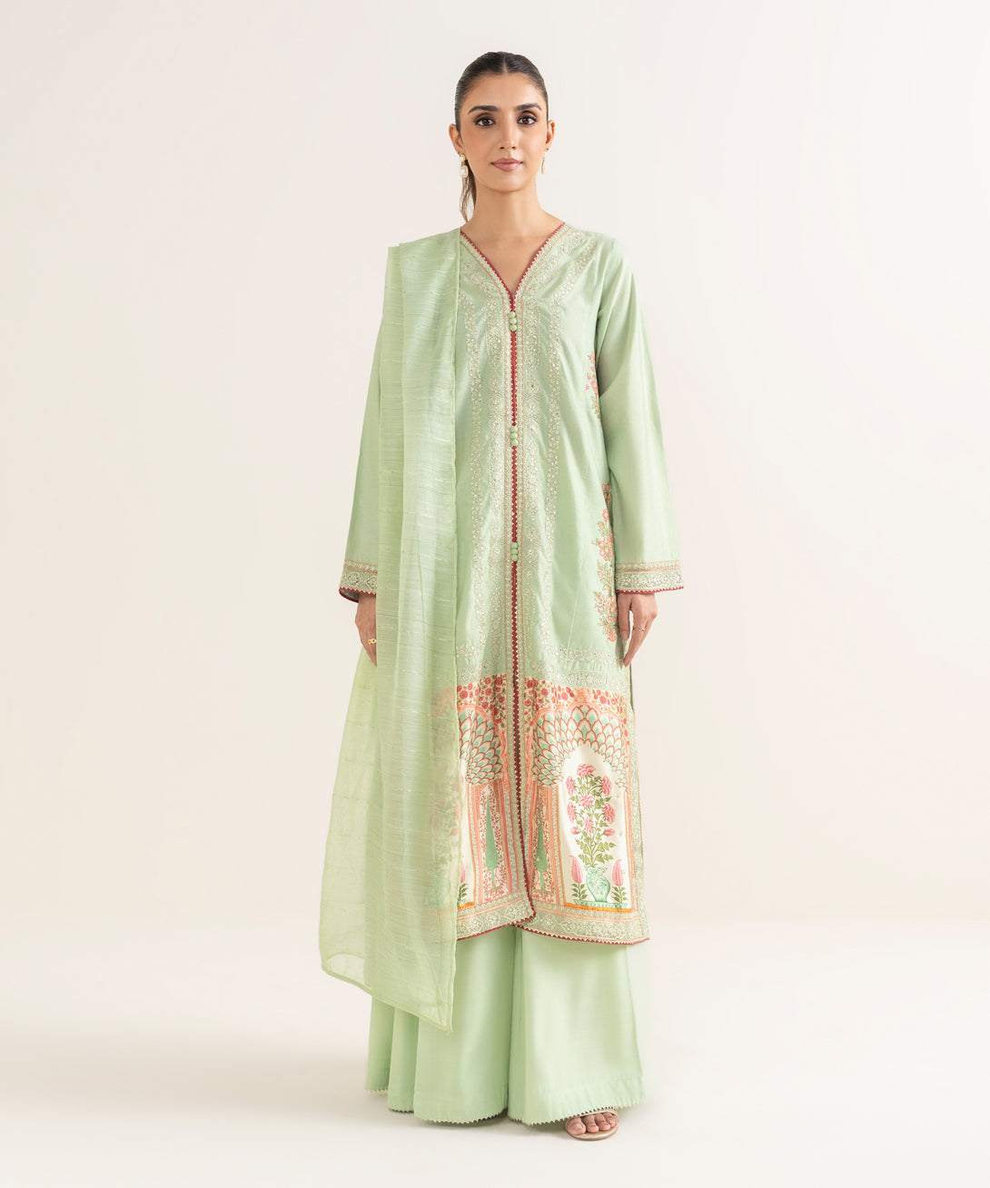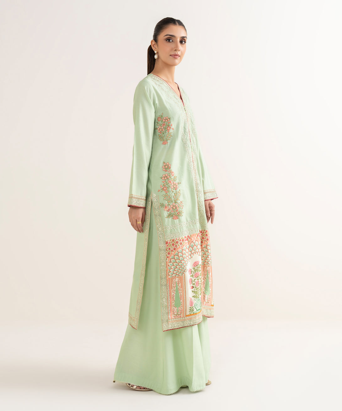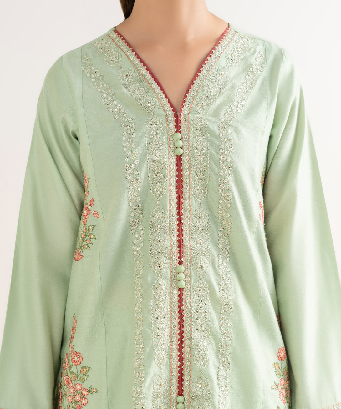 Upgrade your wardrobe with our embroidered mint green silk cotton net A-line shirt featuring a v-neckline.