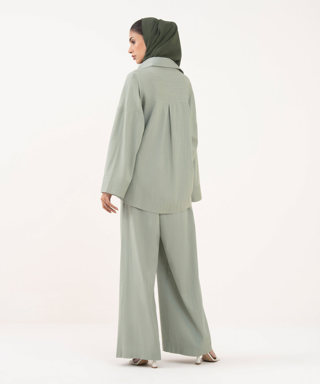 Shirt in breathable fabric. Collar with overlapping placket. Full sleeves with side slits and dropped back.