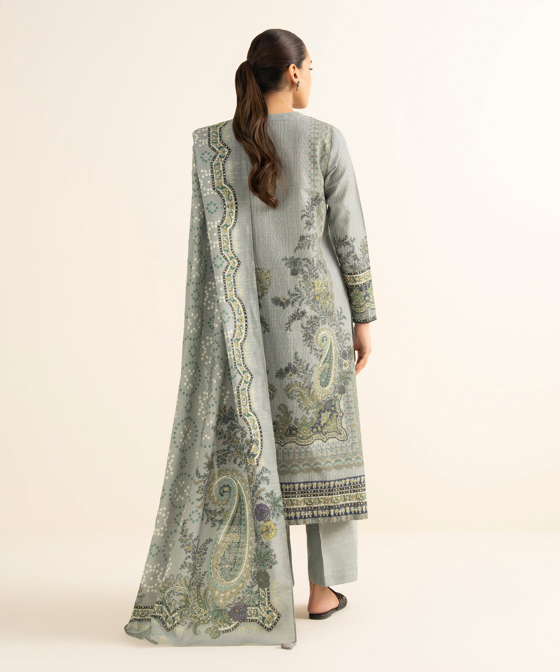 Make a statement with our three-piece printed ensemble featuring a cotton shirt and trousers paired with a voile dupatta.