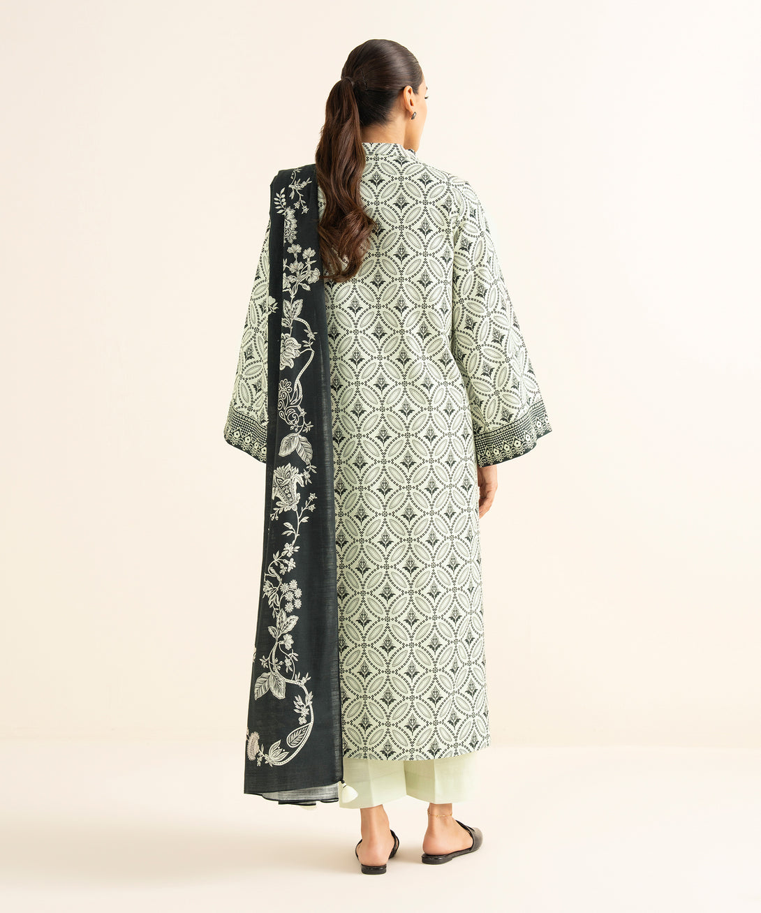 Make a statement with our three-piece printed black and off-white ensemble featuring a lawn shirt and trousers paired with a matching dupatta.