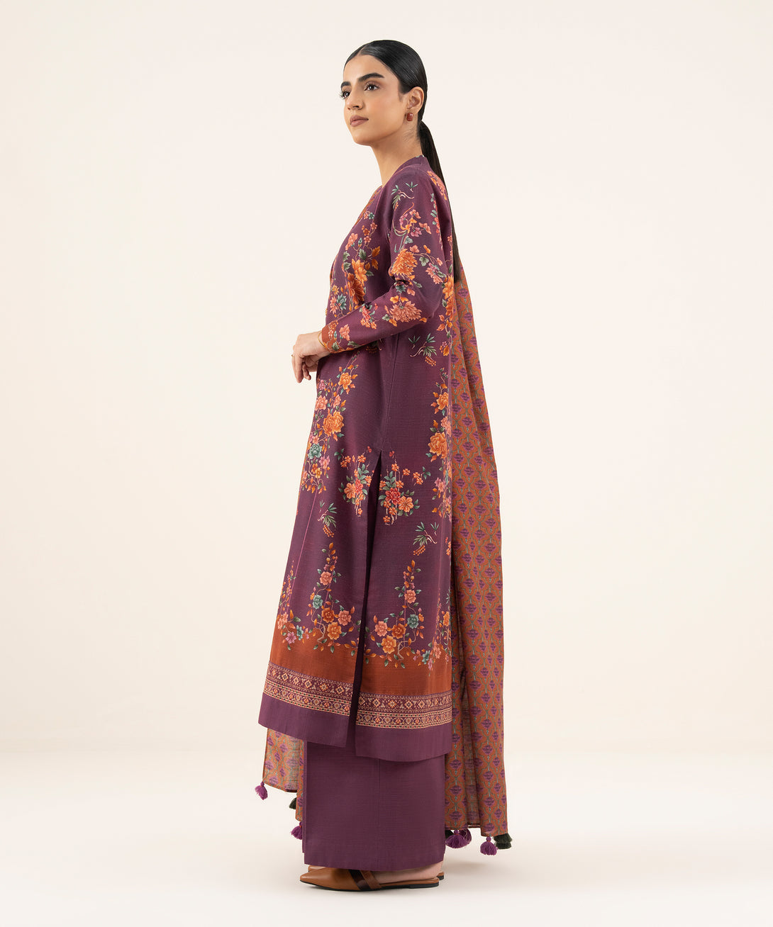 Elevate your style with our three-piece printed magenta ensemble featuring a cotton shirt and trousers paired with a voile dupatta.