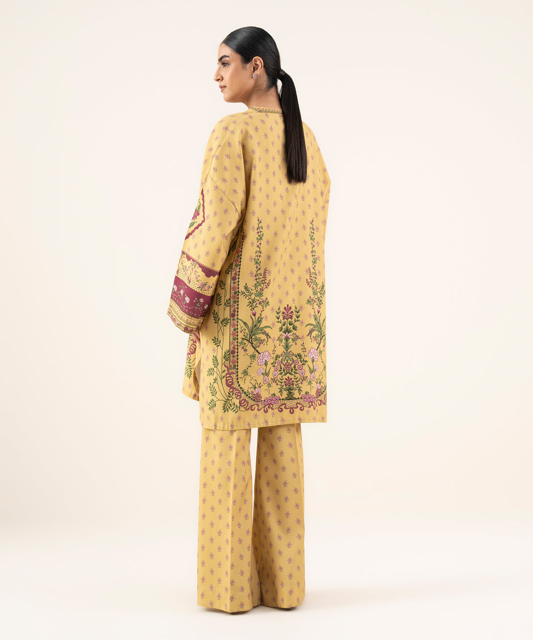 Make a statement with our two-piece printed beige ensemble featuring a lawn shirt and trousers.