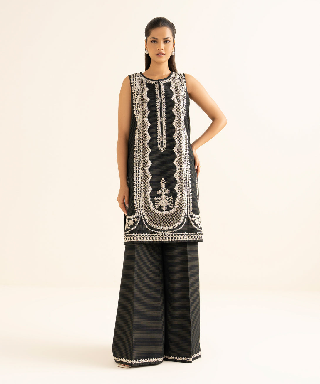 Make a statement with our two-piece embroidered black ensemble featuring a cotton shirt and trousers.