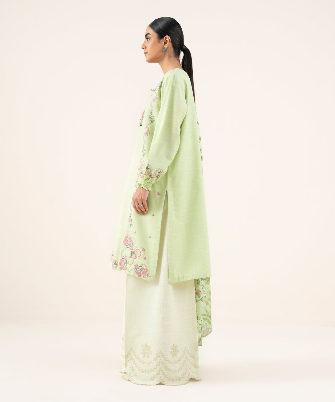 Elevate your style with our two-piece embroidered ensemble featuring a khaddar shirt paired with a matching dupatta.