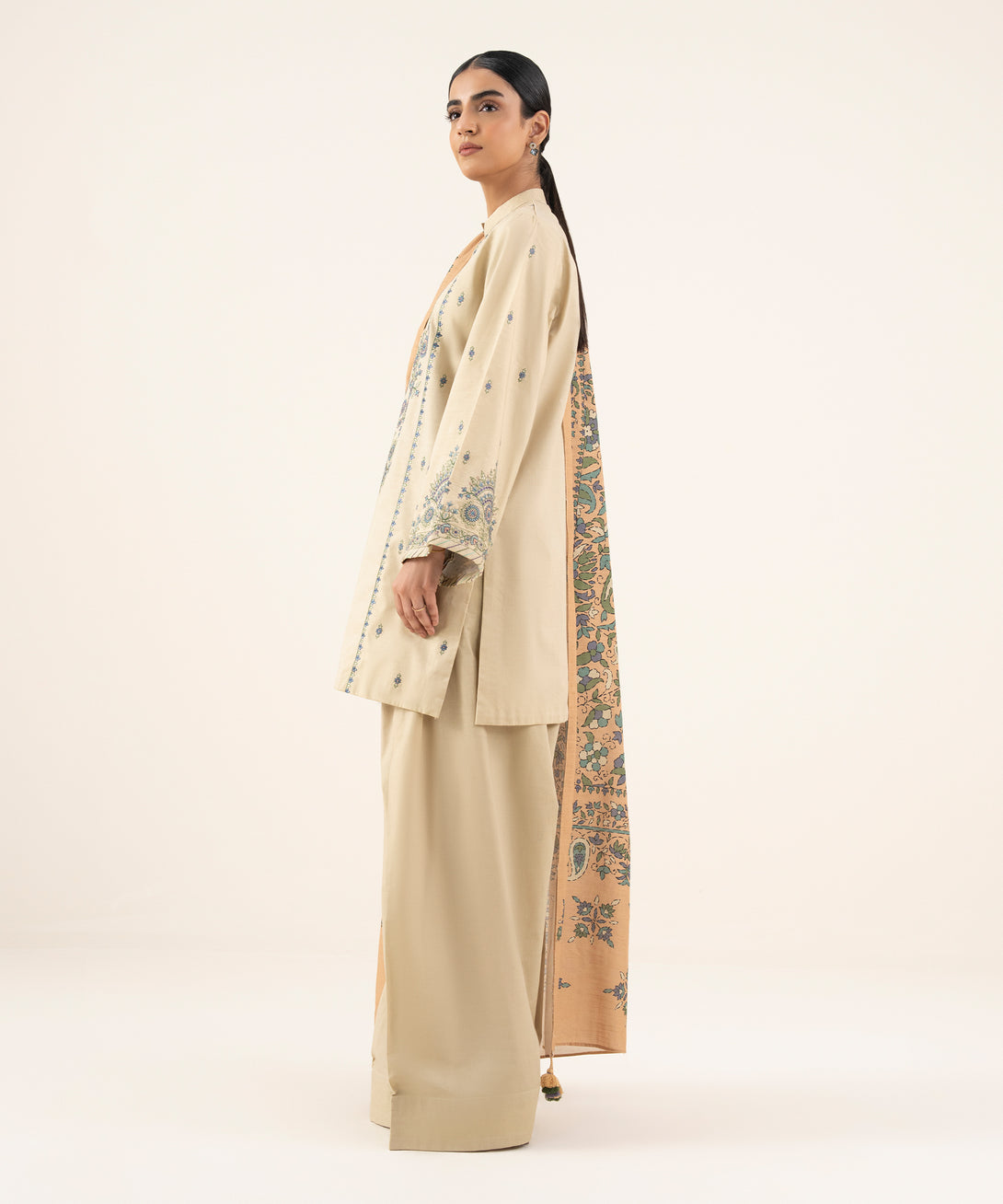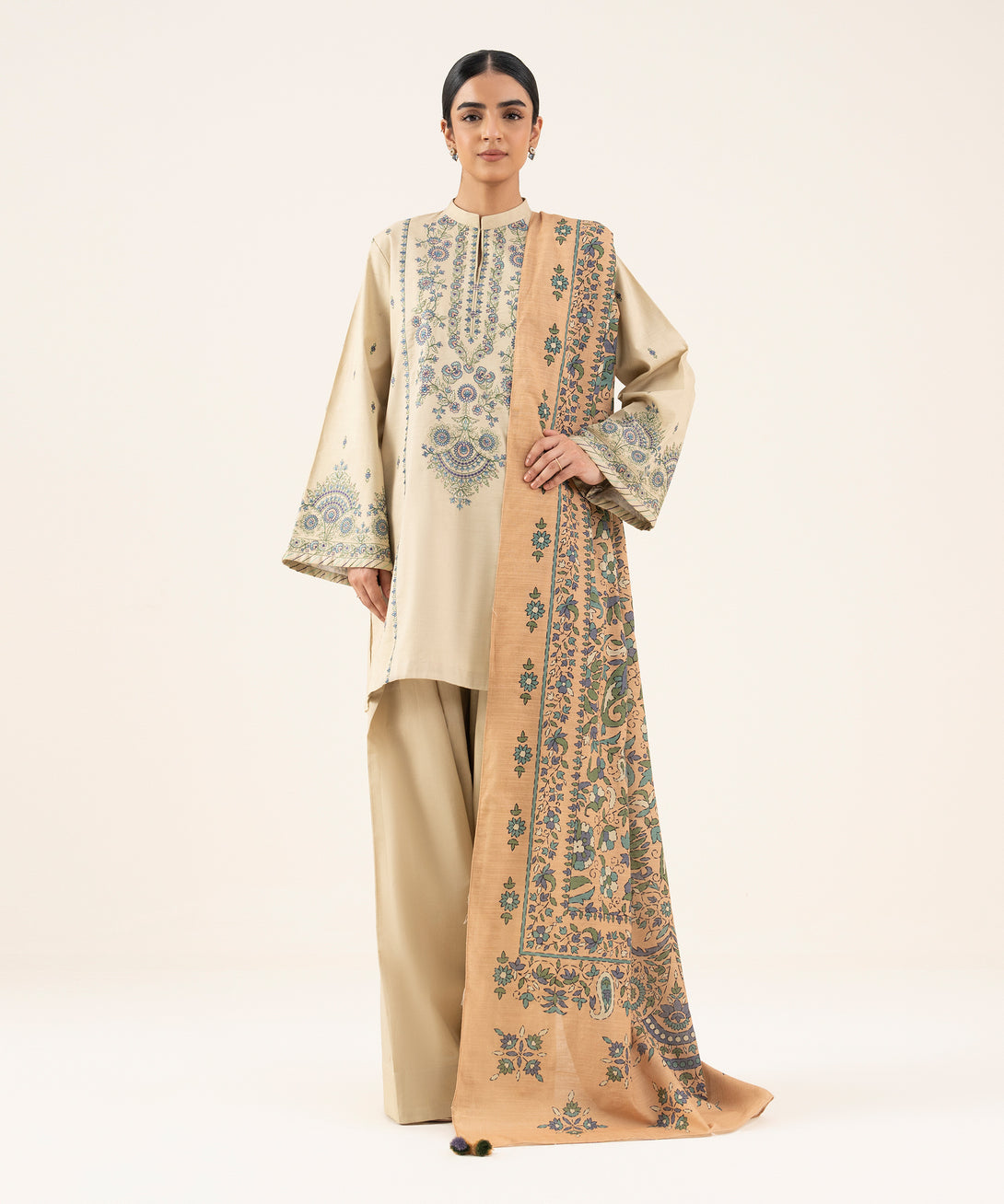 Make a statement with our two-piece embroidered ensemble featuring a textured cotton shirt paired with a blended dupatta.