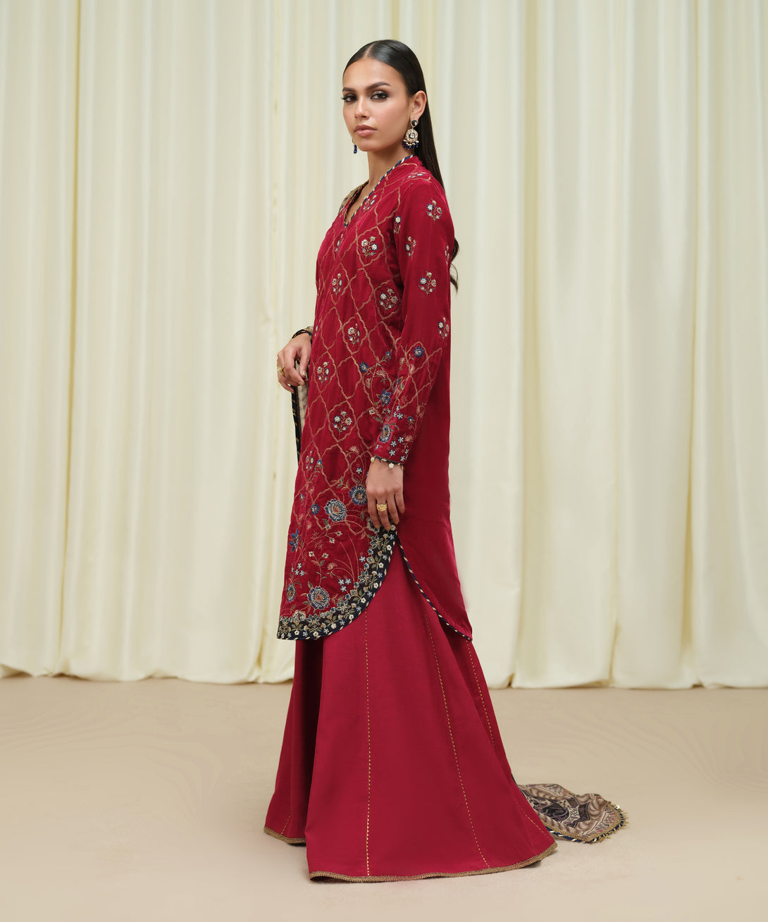Make a statement with our three-piece formal ensemble featuring a velvet shirt paired with a bemberg tissue dupatta and viscose raw silk trousers.