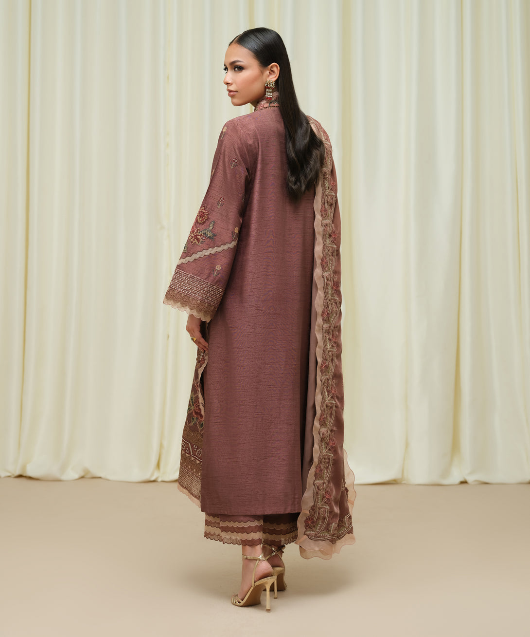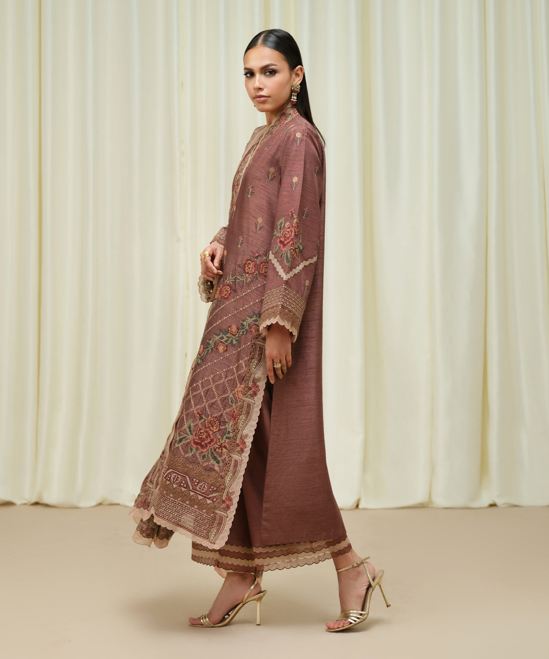 Elevate your style with our three-piece formal ensemble featuring a raw silk shirt paired with a velvet dupatta and dull raw silk trousers.
