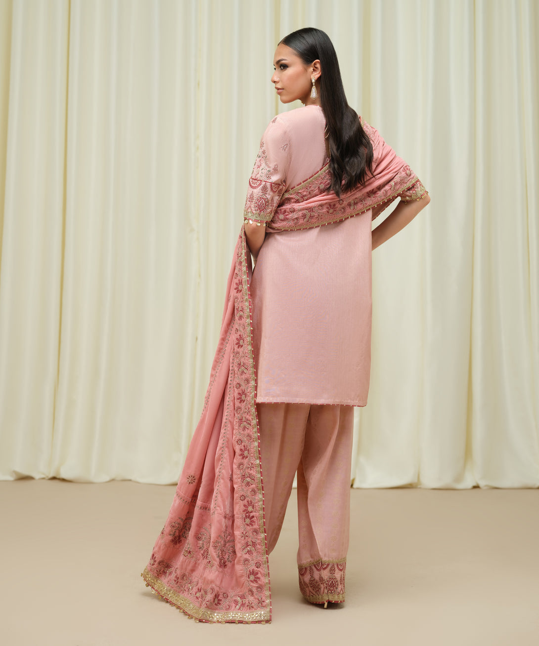 Elevate your style with our three-piece formal ensemble featuring a raw silk shirt paired with a velvet dupatta and extra-weft jacquard trousers.