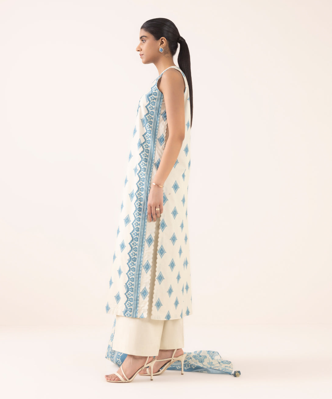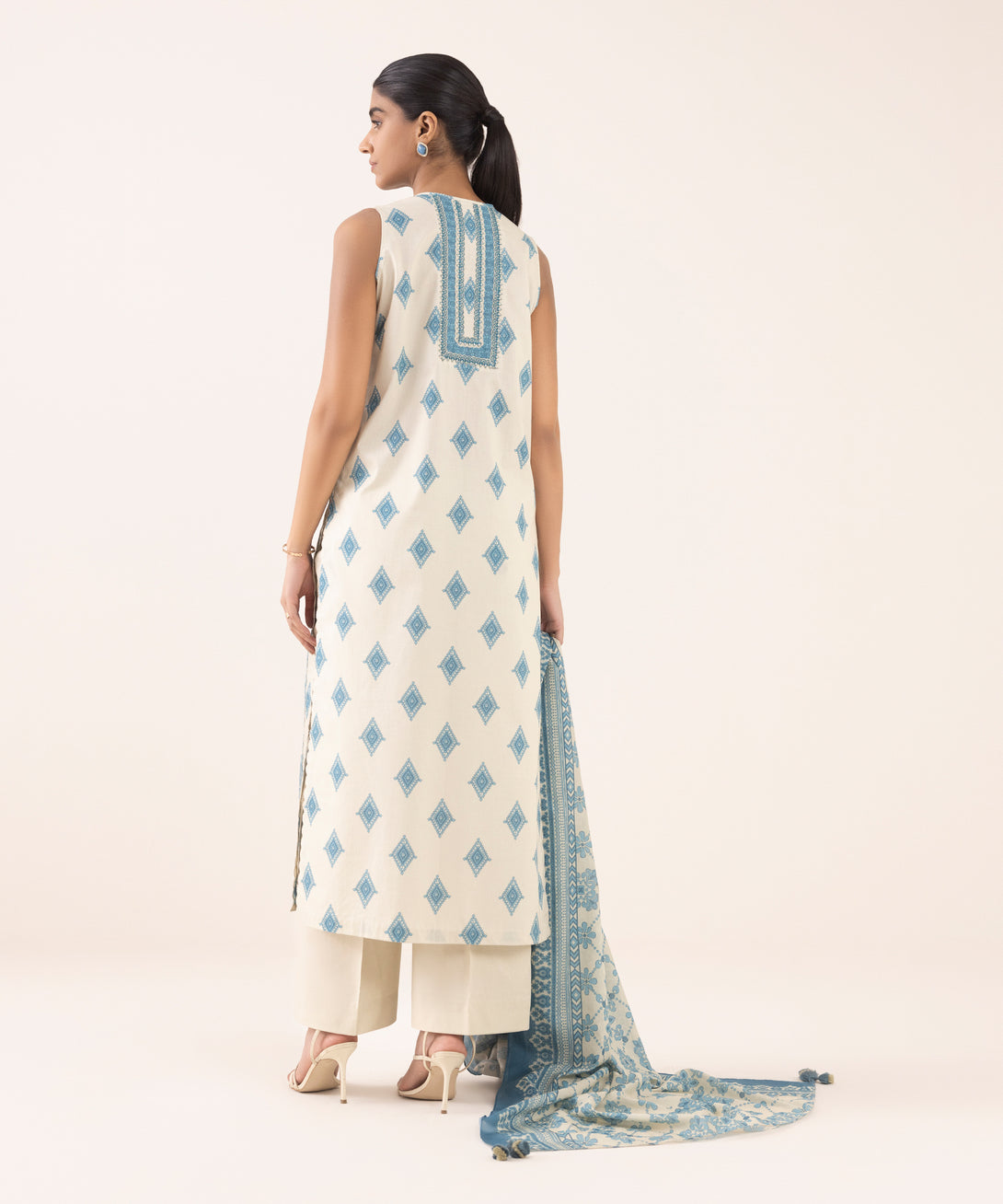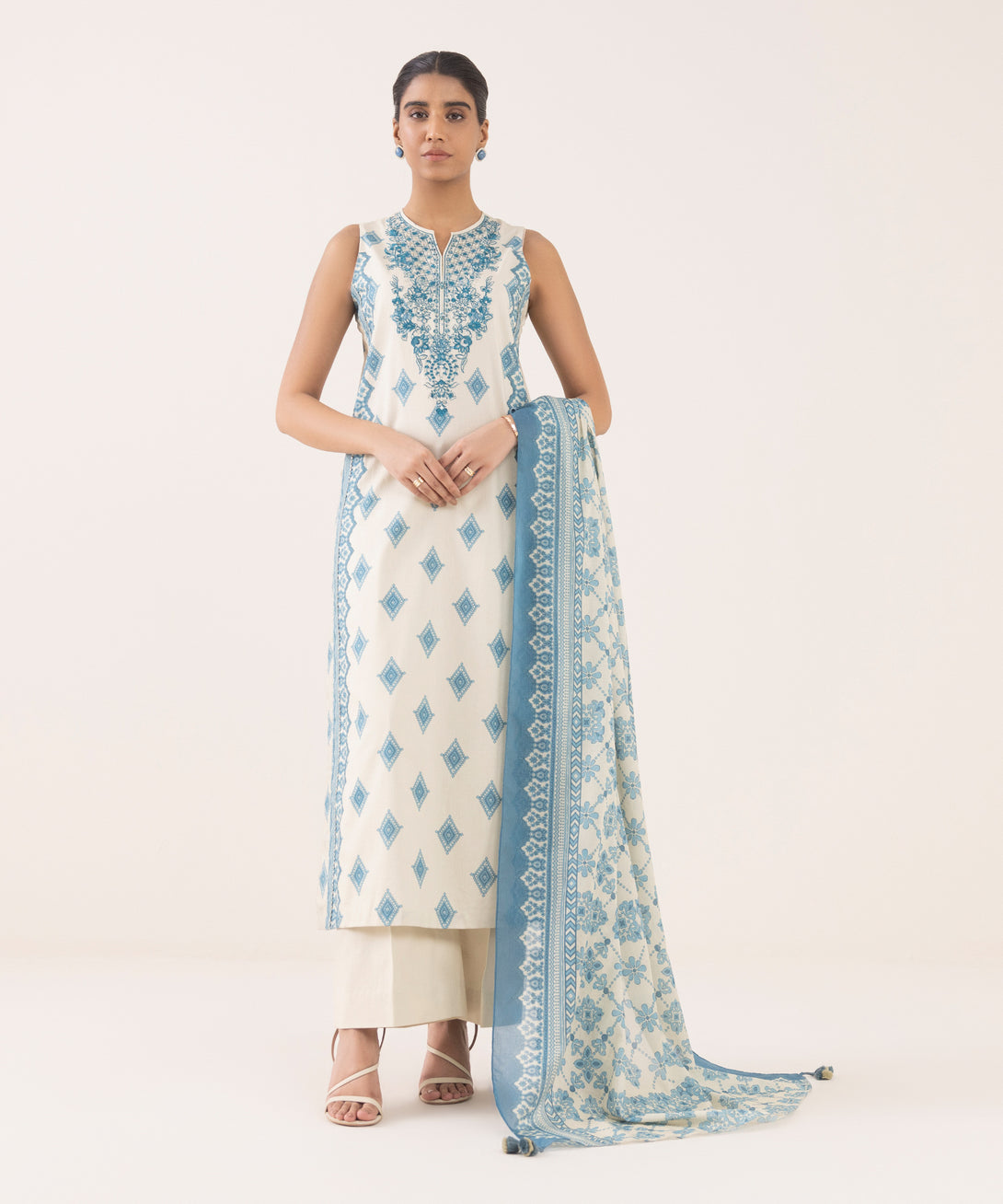 Make a statement with our three-piece embroidered ensemble featuring a lawn shirt paired with a voile dupatta and cotton trousers.