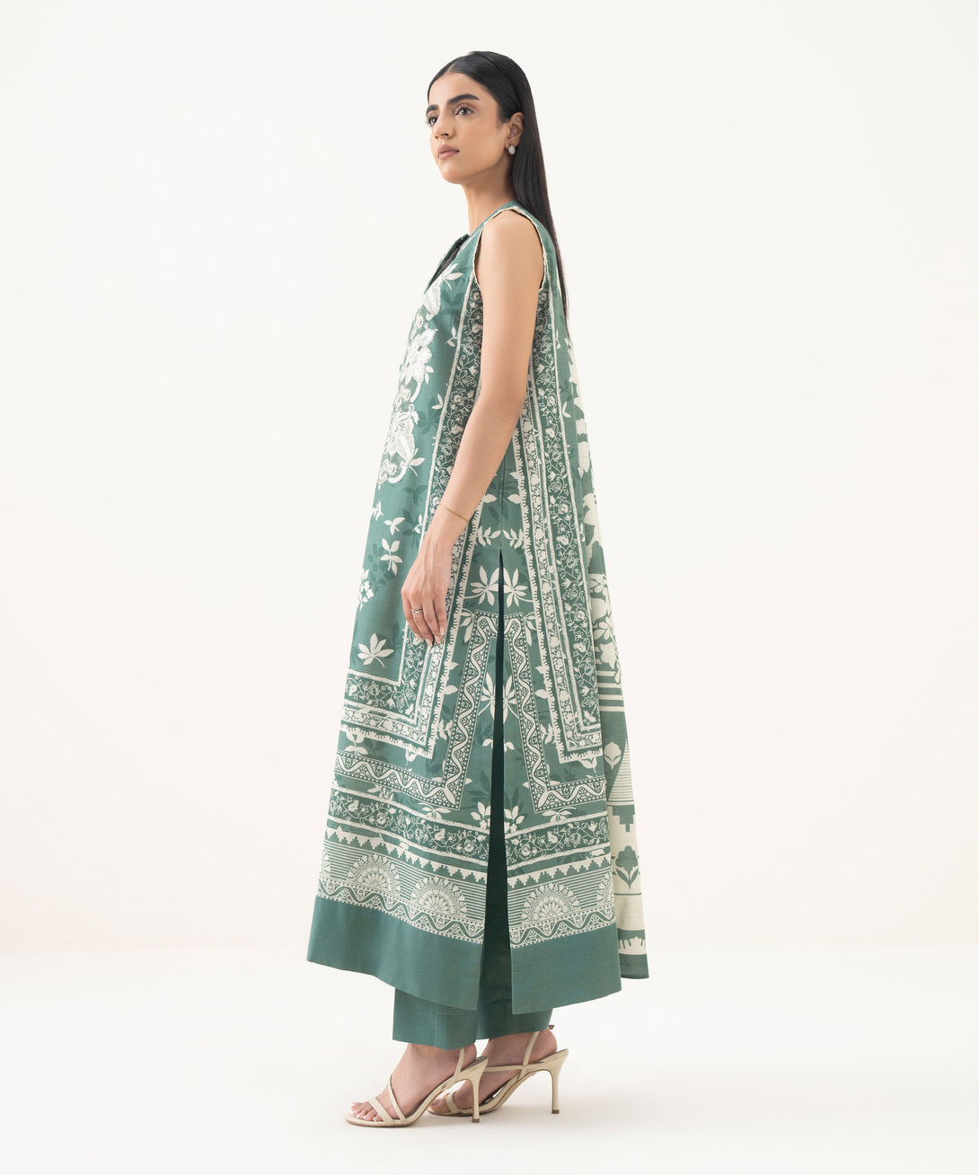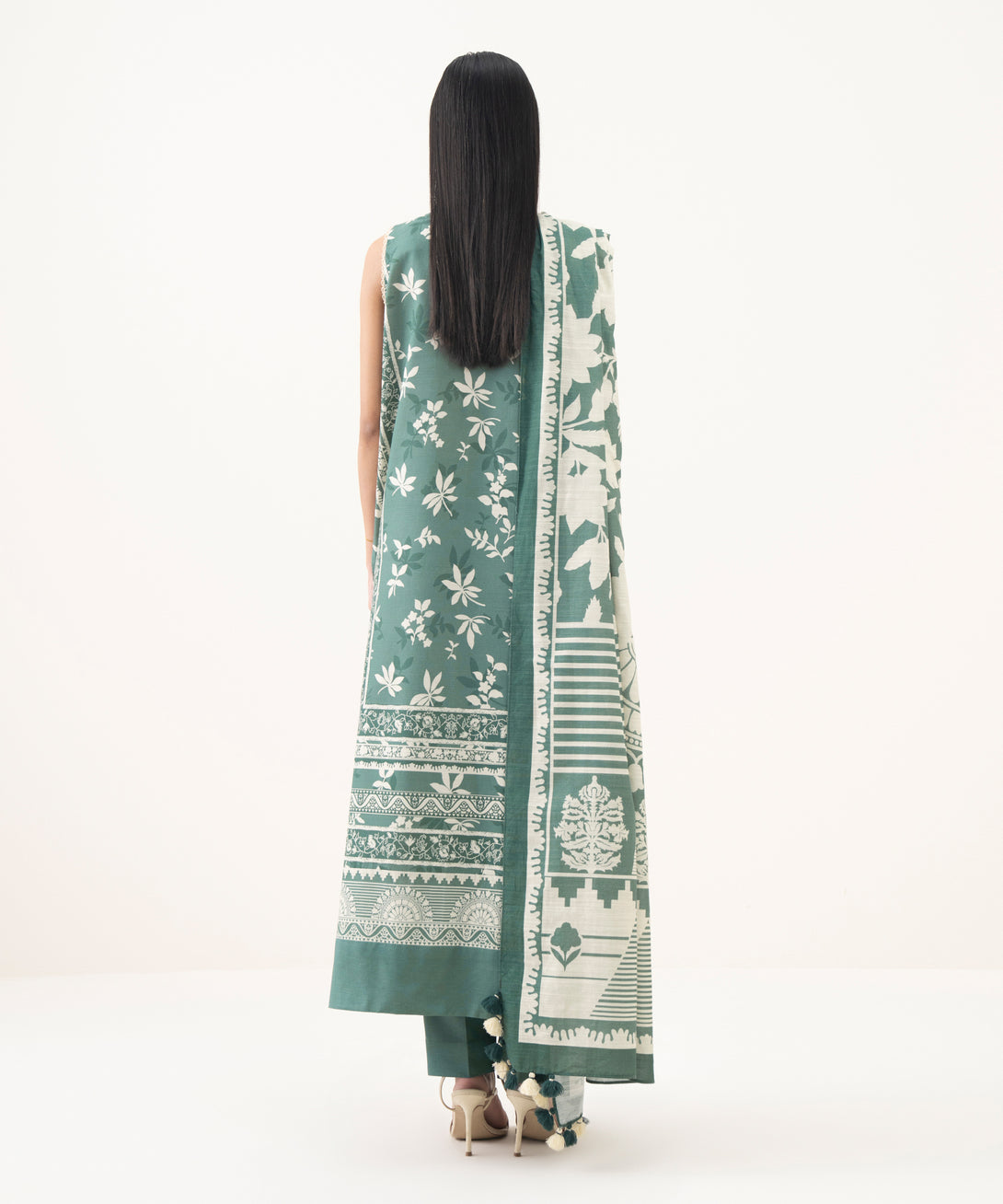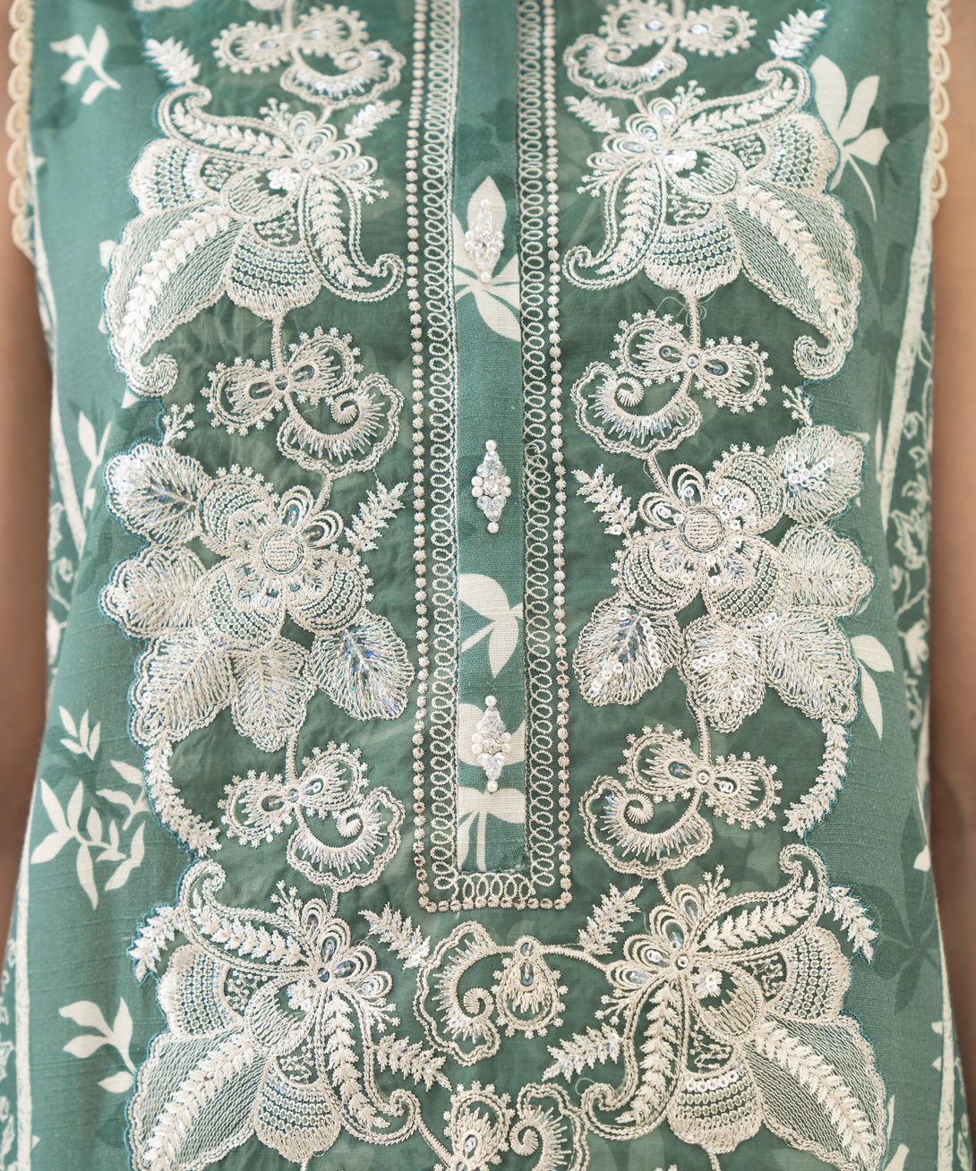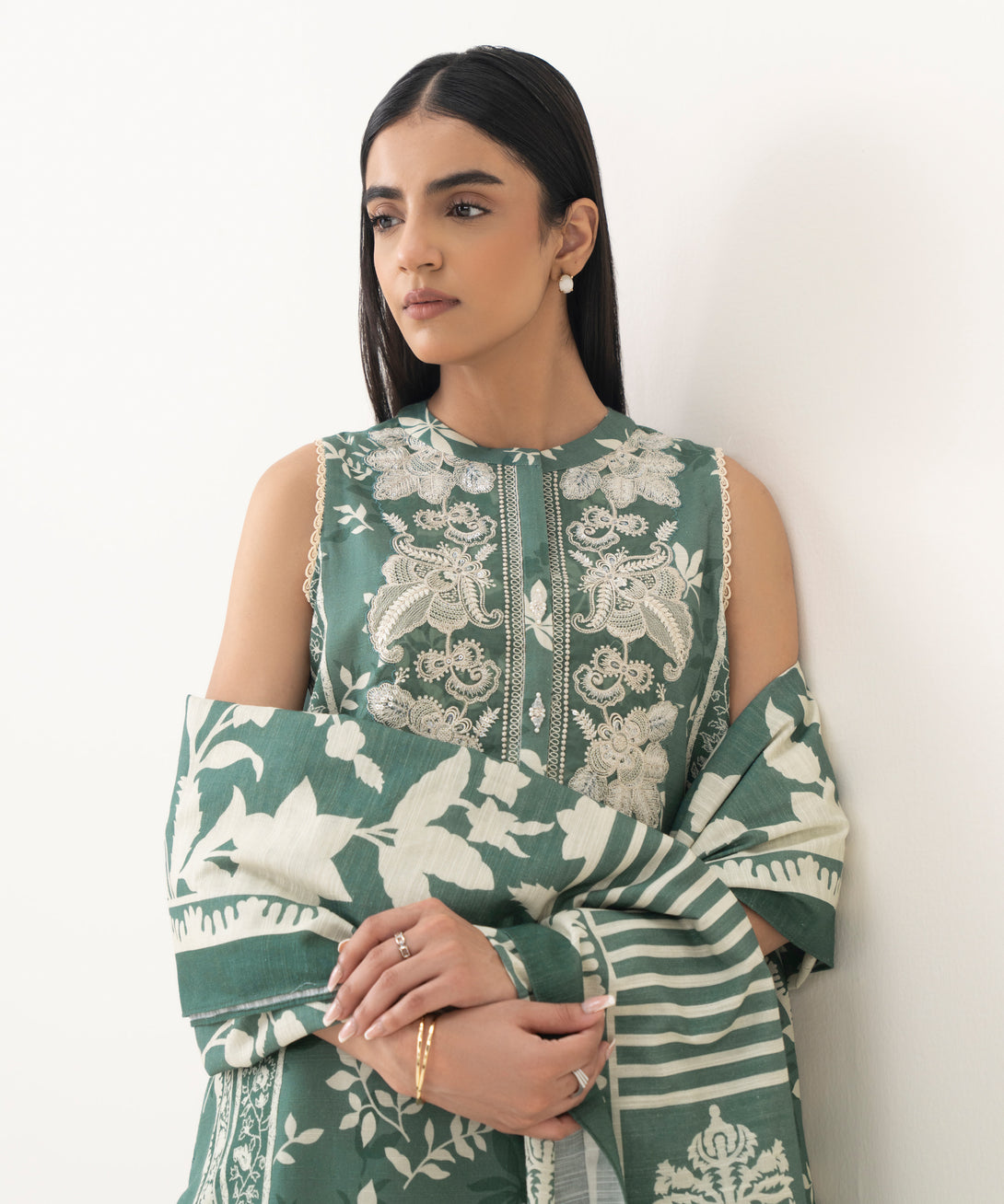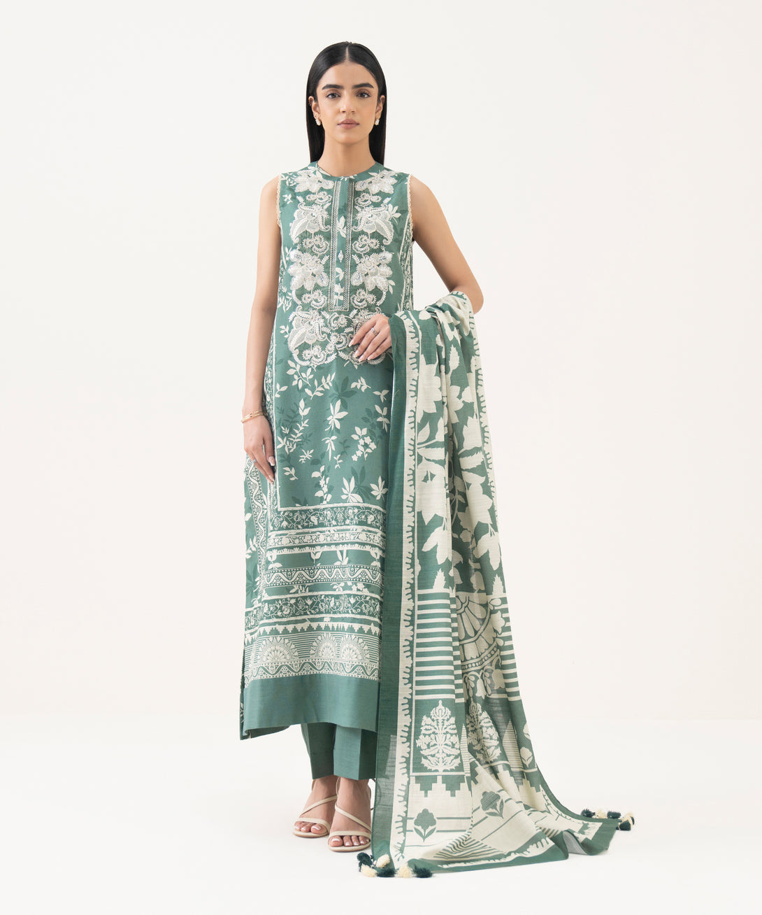 Make a statement with our three-piece embroidered teal green and off white ensemble featuring a khaddar shirt paired with a blended shawl and light khaddar trousers.