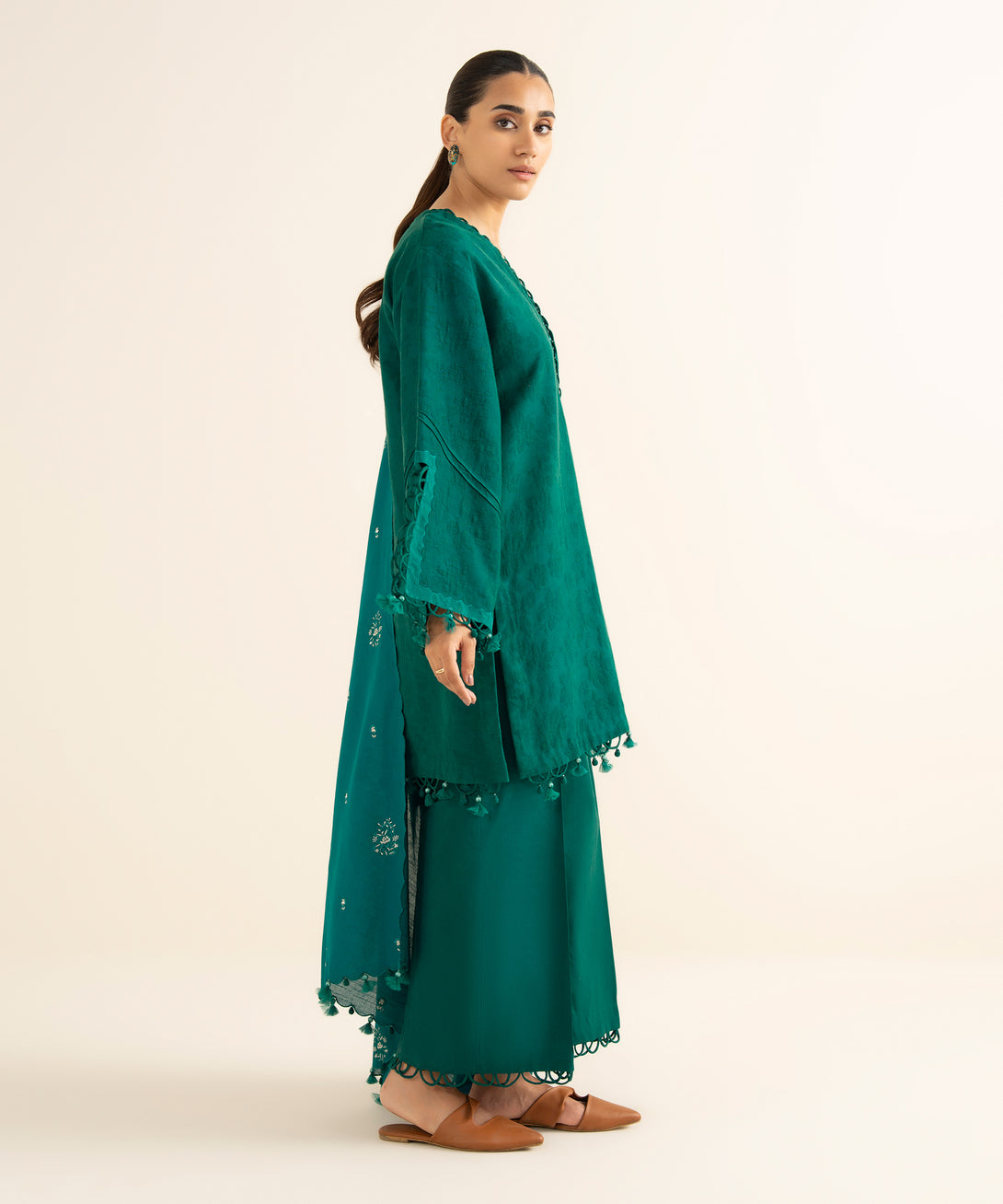 Elevate your style with our three-piece embroidered teal green ensemble featuring a cotton jacquard shirt paired with a light khaddar dupatta and cotton trousers.