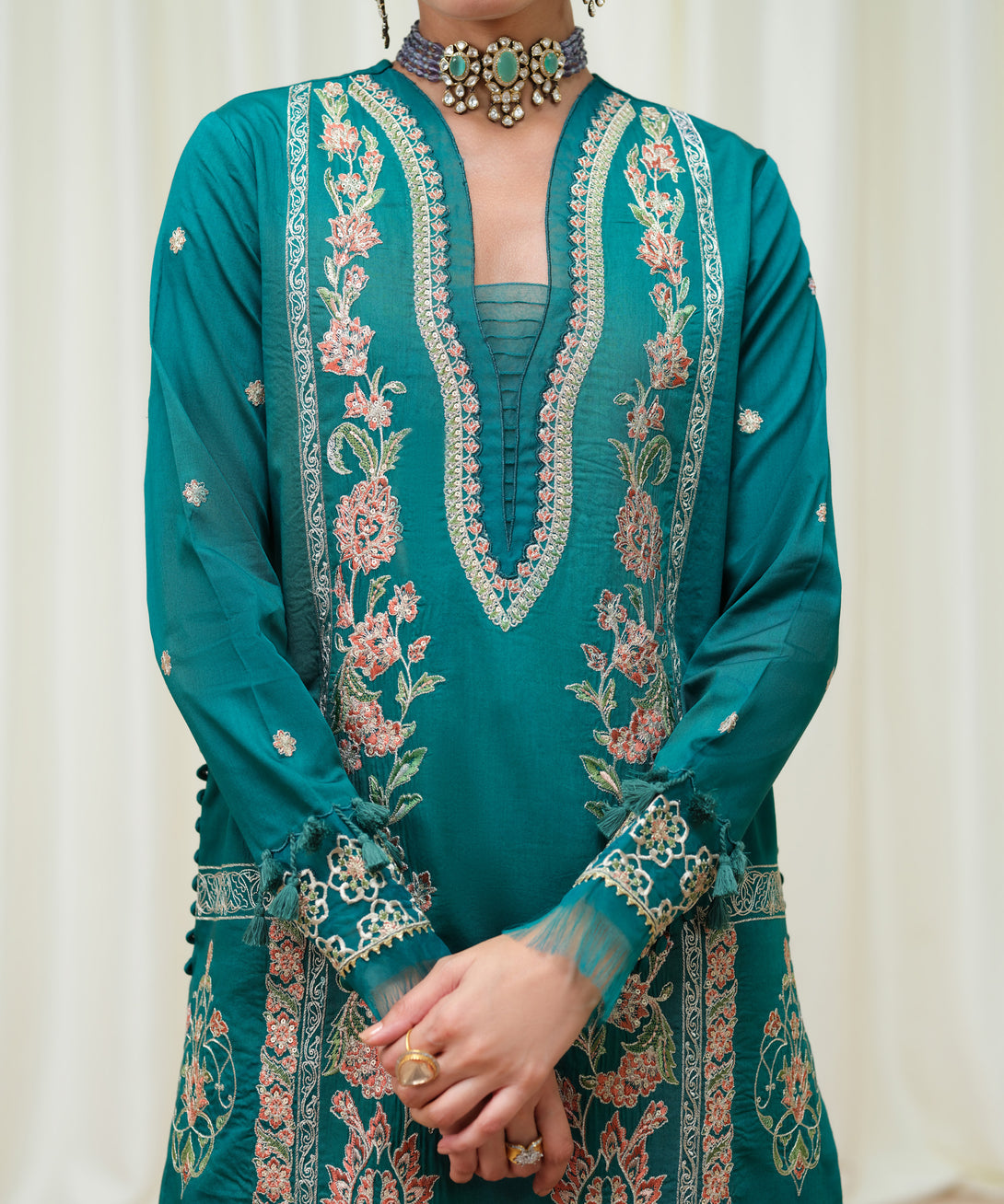 Make a statement with our three-piece embroidered ensemble featuring a fine cotton satin shirt paired with a crinkle chiffon dupatta and cotton trousers.