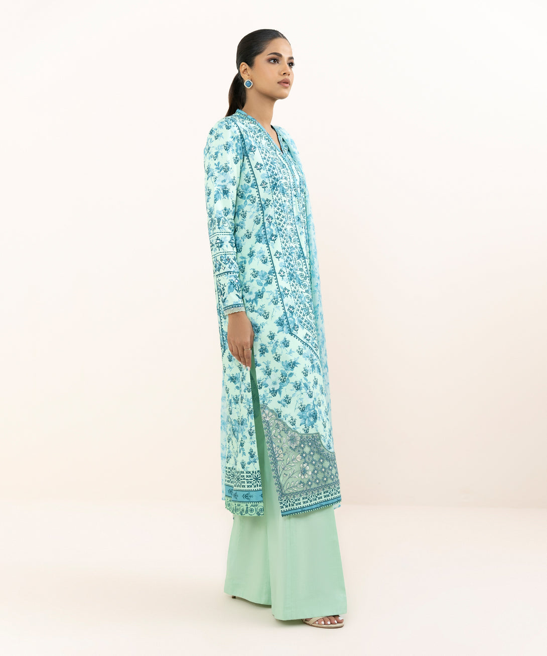 Make a statement with our three-piece embroidered mint green ensemble featuring a cotton viscose shirt and trousers paired with a blended chiffon dupatta.