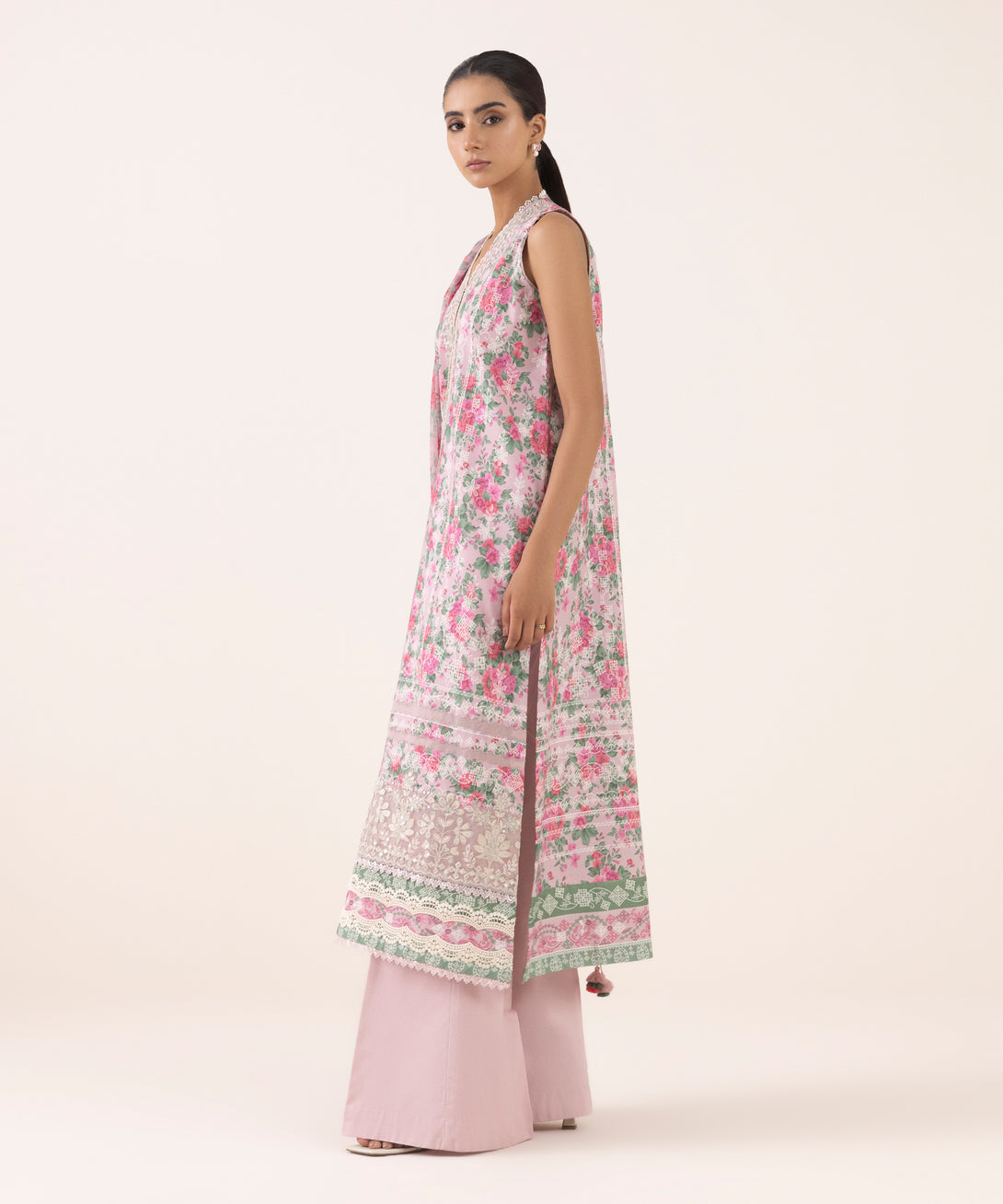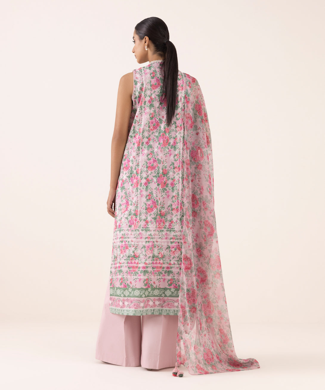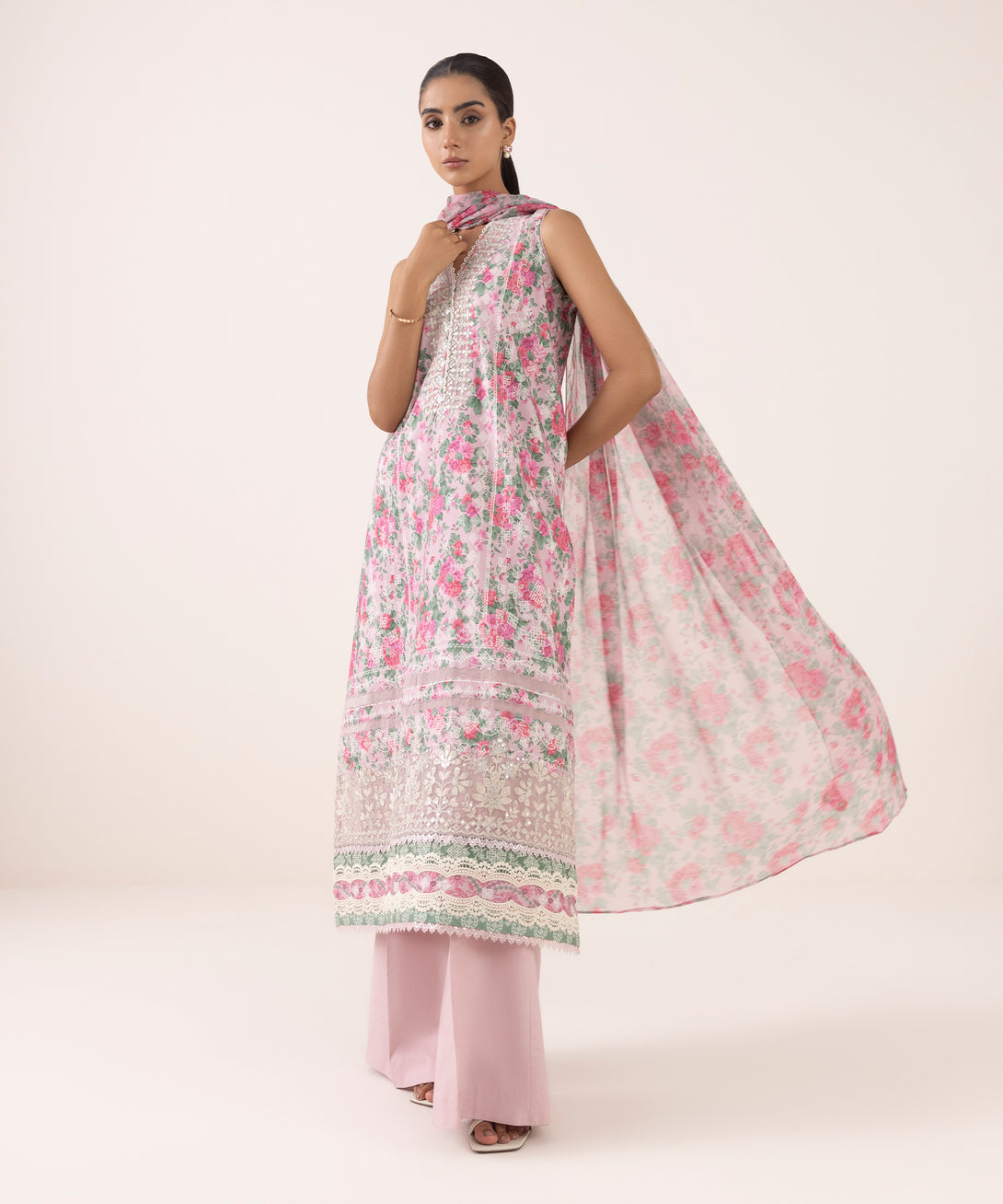 Make a statement with our three-piece embroidered pink and green ensemble featuring a cotton viscose shirt and trousers paired with a blended chiffon dupatta.