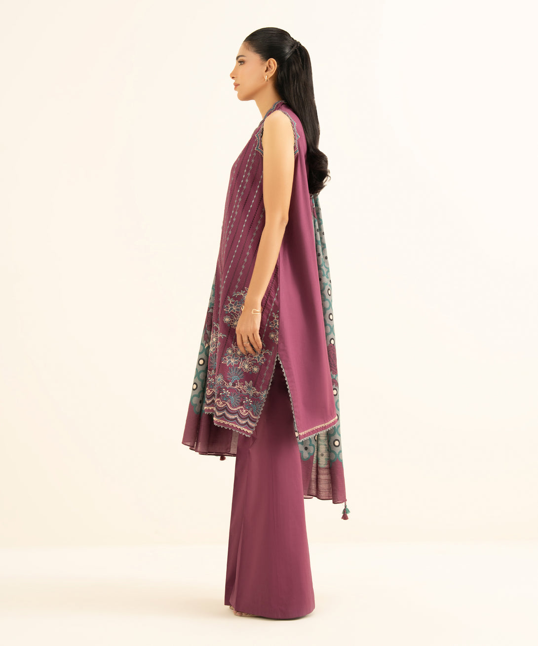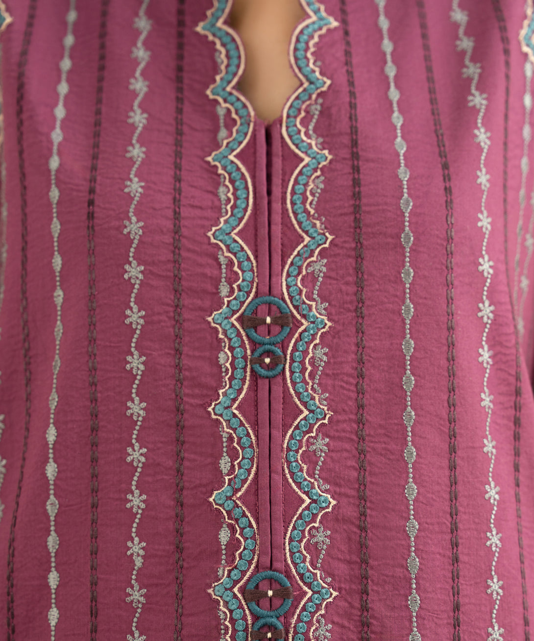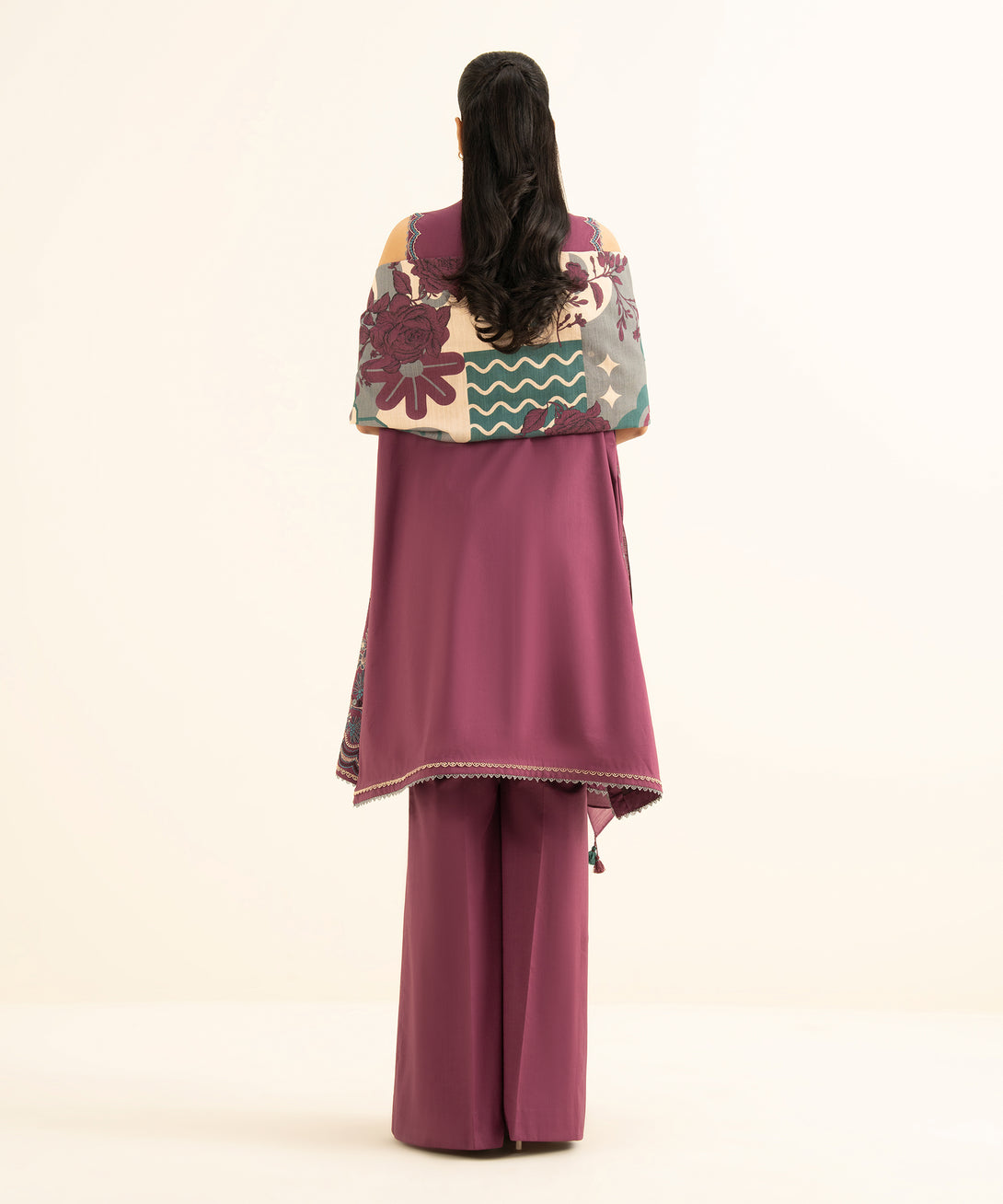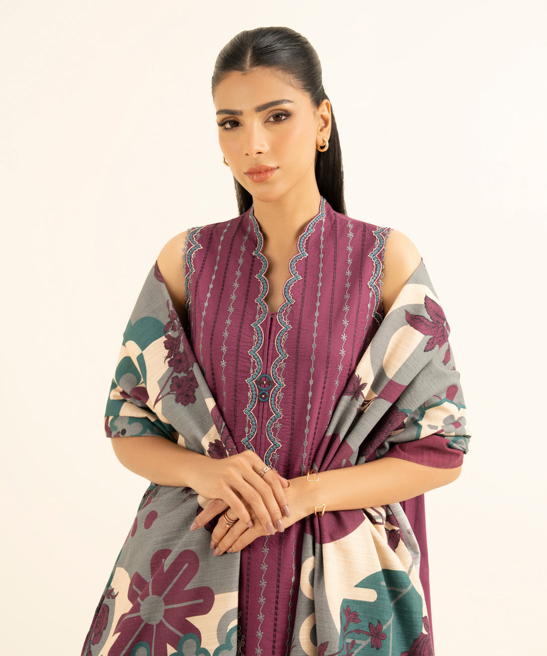 Make a statement with our three-piece embroidered maroon ensemble featuring a crosshatch shirt and trousers paired with a blended shawl.