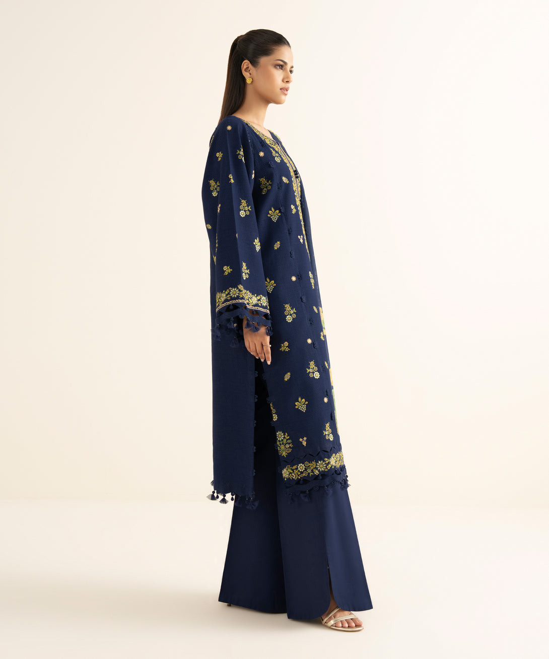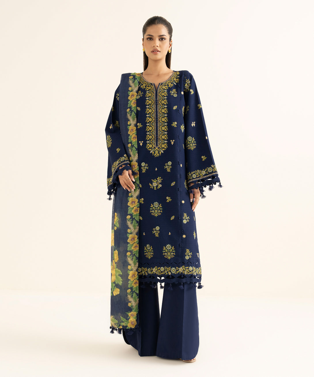 Make a statement with our three-piece embroidered blue ensemble featuring a dobby shirt and cotton trousers paired with a manaar dupatta.