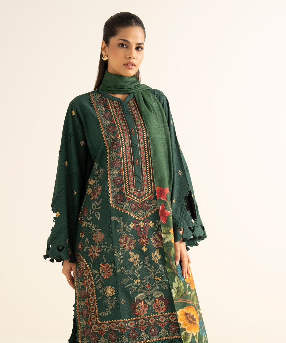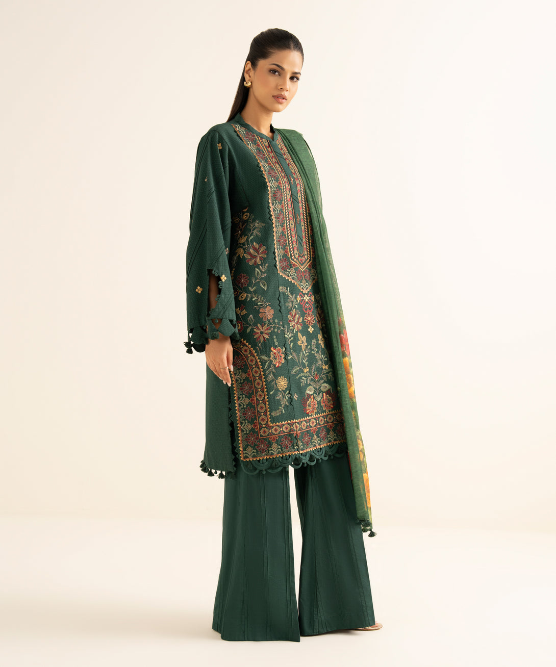 Make a statement with our three-piece embroidered green ensemble featuring a dobby shirt and cotton trousers paired with a manaar dupatta.