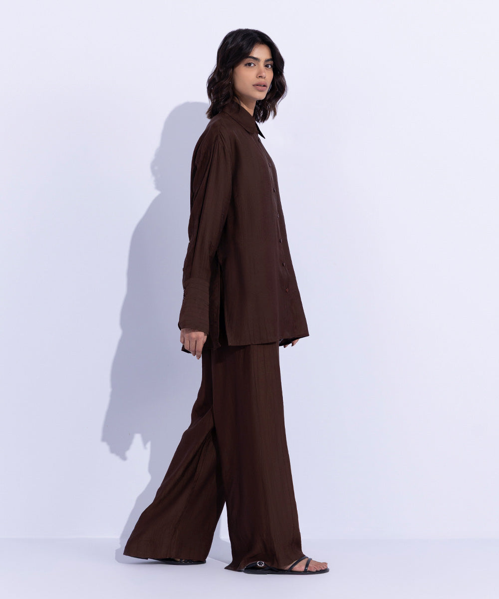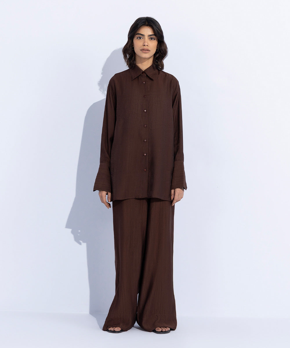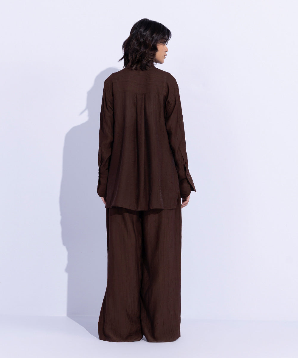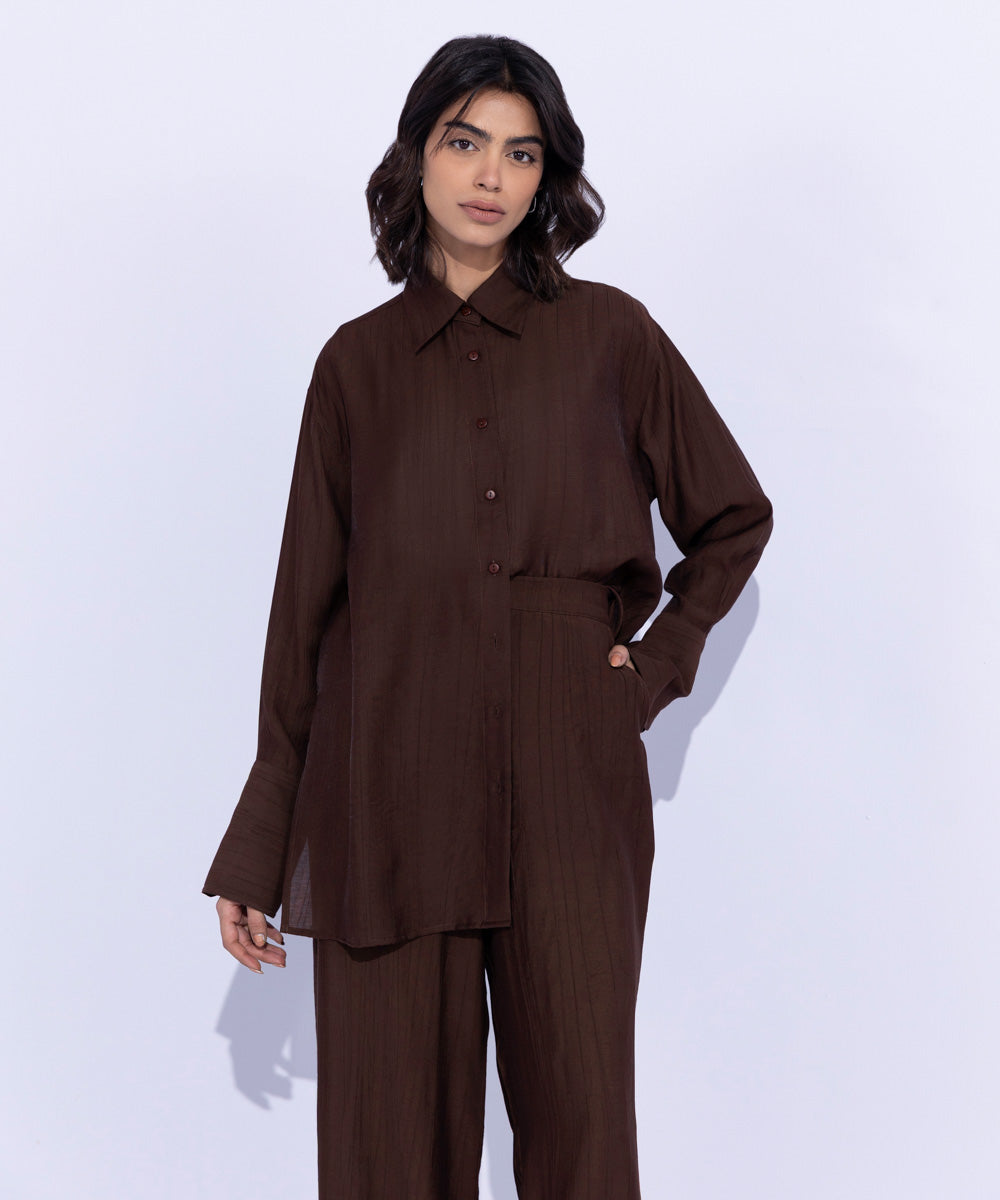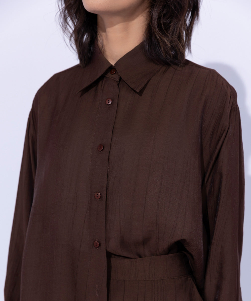 Button through shirt in textured fabric with collar. Full sleeves with cuff and button details. Side slits. Back yoke with box pleat.
