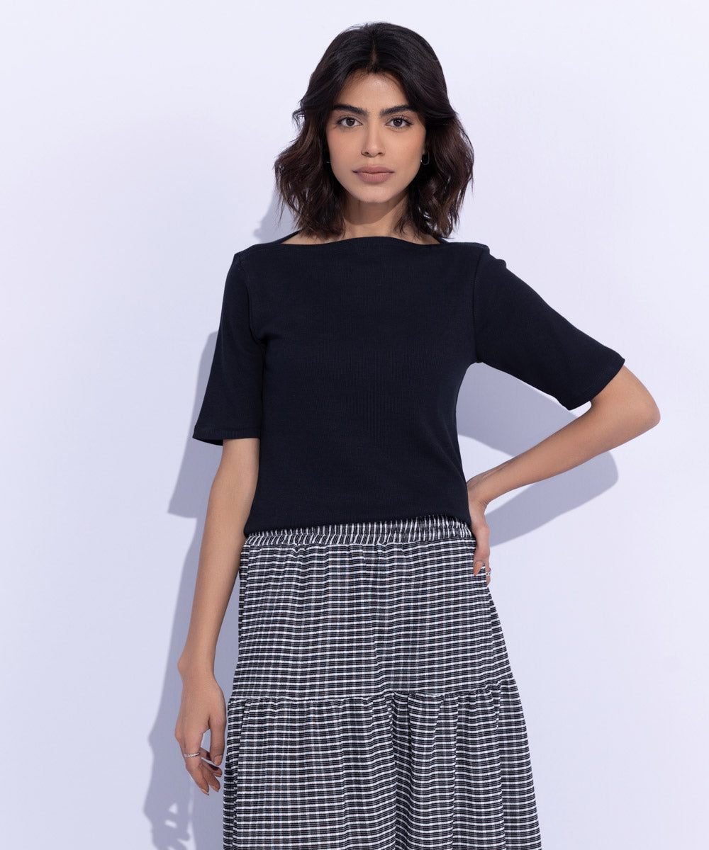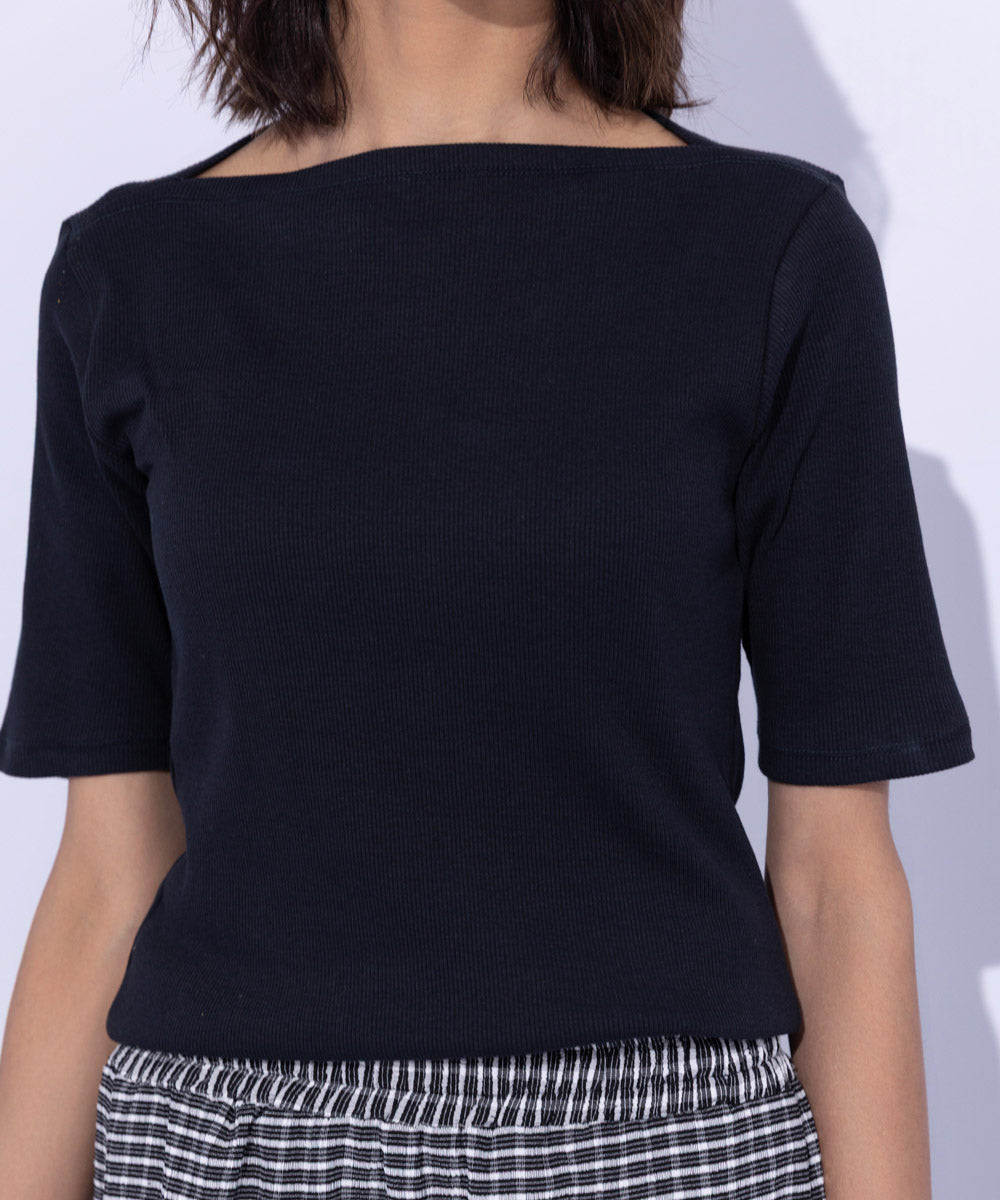 Slim fit top in soft rib fabric. Slash neck with short sleeves.